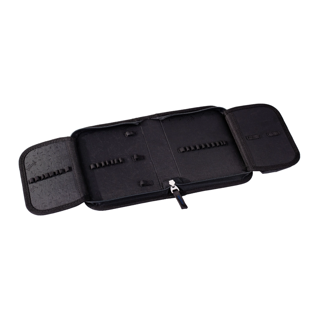 Kihajtható tolltartó két füllel, erős gumis rögzítésekkel a színes ceruzákhoz és YKK cipzárral. A pénztárca nyakpánttal biztonságosan tárolja az aprópénzt és a kártyákat.