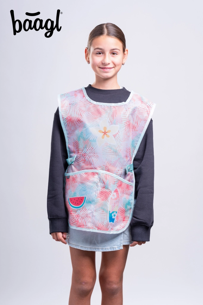 Praktikus kötény nagy elülső zsebbel és oldalsó megkötéssel – védi a ruhát rajzórán, főzésnél és kreatív foglalkozásokon.