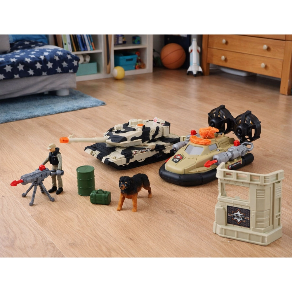 A gyermekeknek szánt, nagyszabású katonai készlet tartalmaz egy tankot fény- és hangeffektekkel, egy helikoptert rakétavetővel, egy légpárnás járművet, katonai figurákat, kutyát és egy katonai bázist. A forgatható toronnyal rendelkező tanknak, a mozgó alkatrészeknek és a gazdag tartozékkészletnek köszönhetően a gyerekek saját küldetéseket, járőrözéseket és csatákat alkothatnak, miközben fejlesztik fantáziájukat és kreatív játékukat.