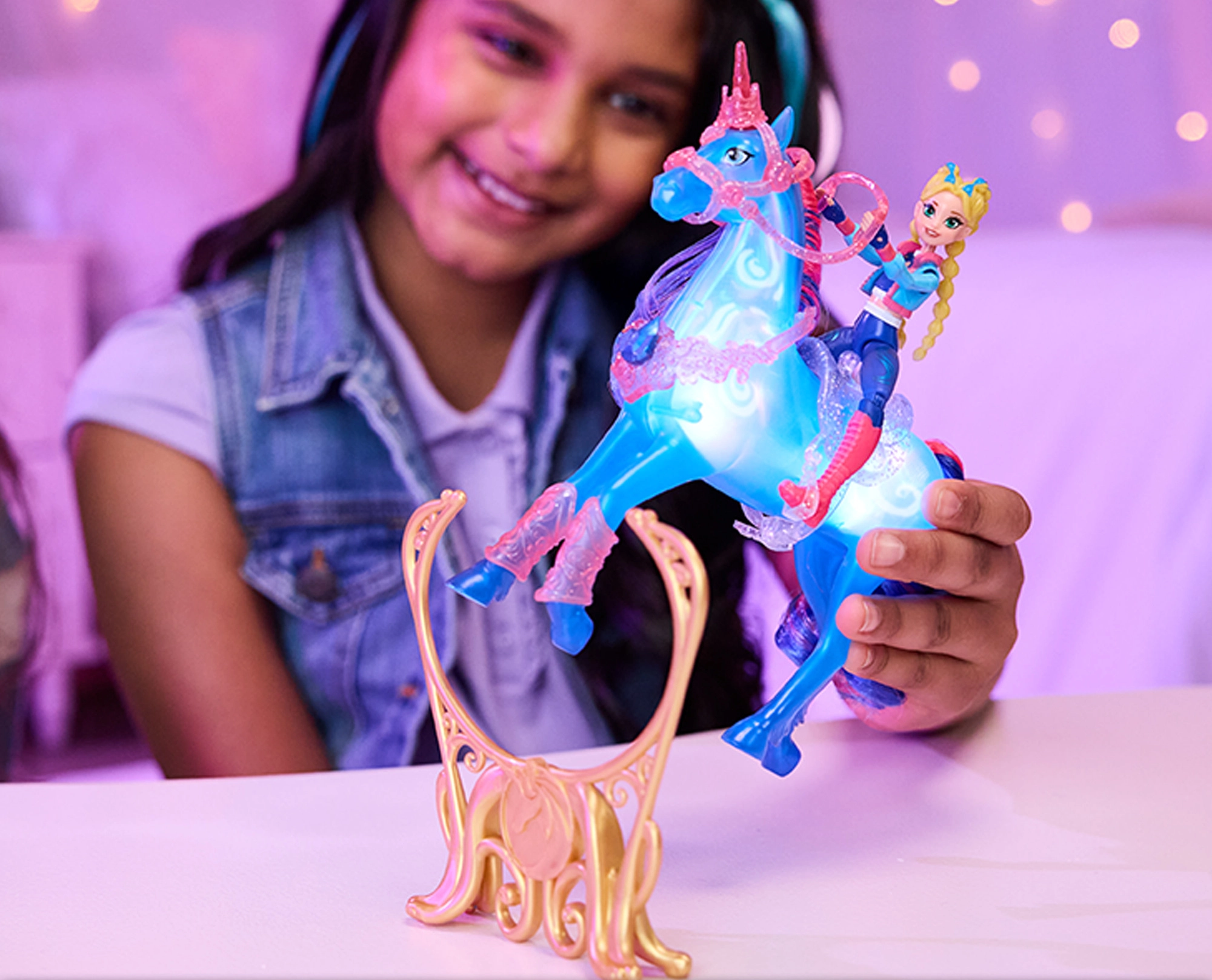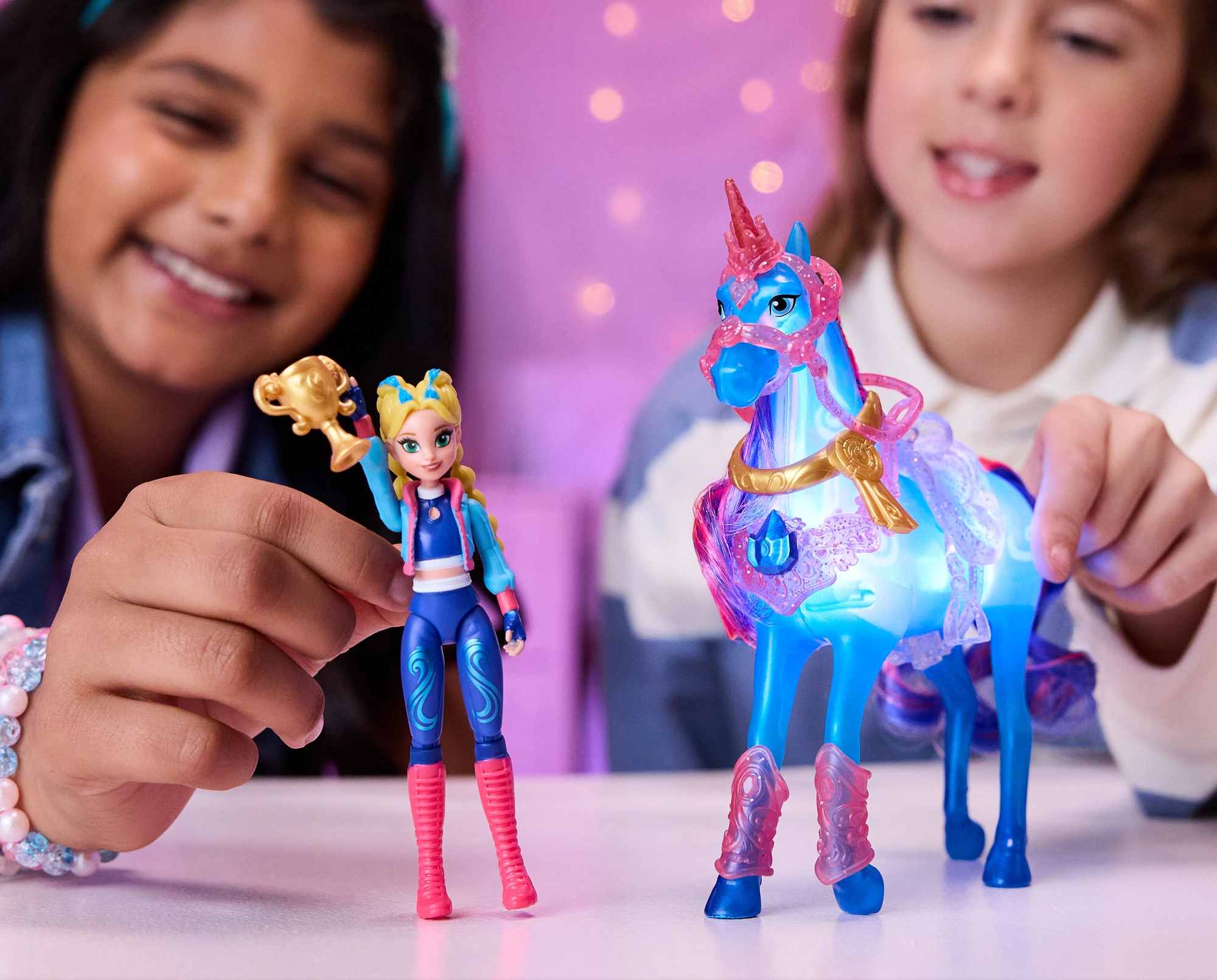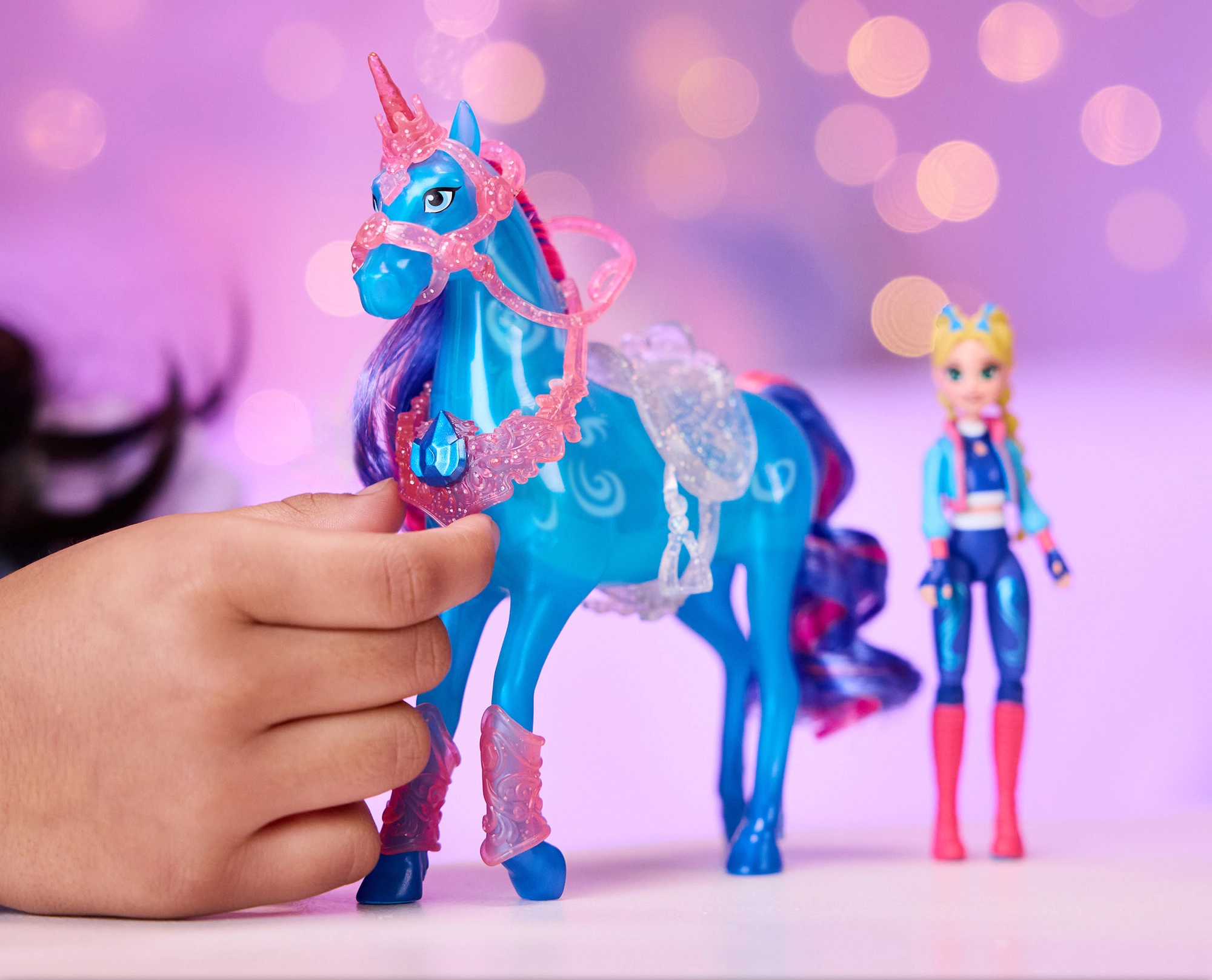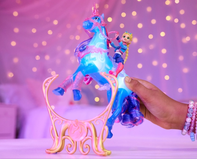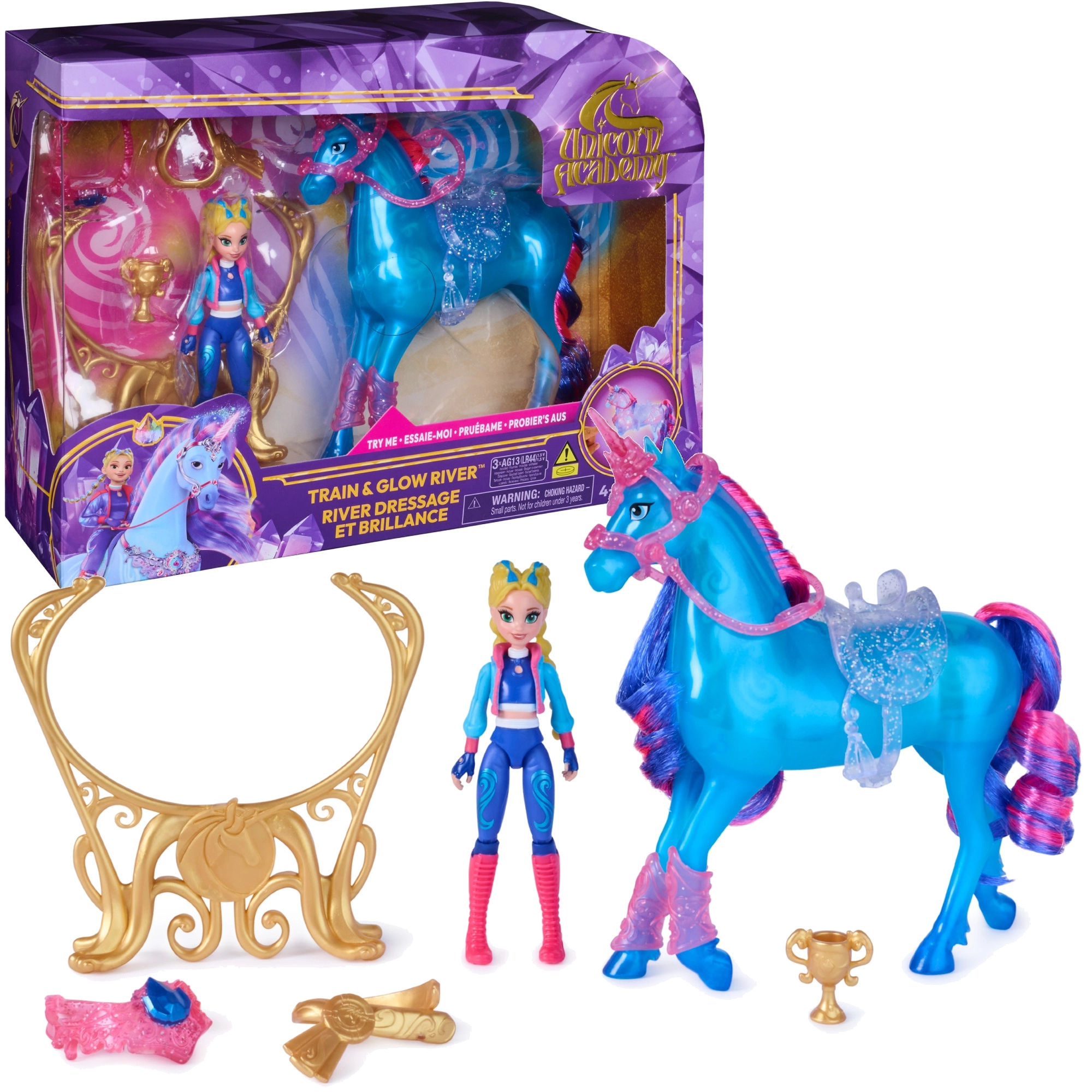 A népszerű Unicorn Academy sorozat által ihletett készlet lehetővé teszi a gyerekeknek, hogy újra átéljék az edzésjeleneteket, és saját varázslatos történeteket alkossanak. Az River unikornis áttetsző műanyagból készült, gyönyörű kék tónusokban világít, és a nyakörv gombjának megnyomásával vagy az akadályon való áthaladással egyedi hangulatot ad a játéknak.