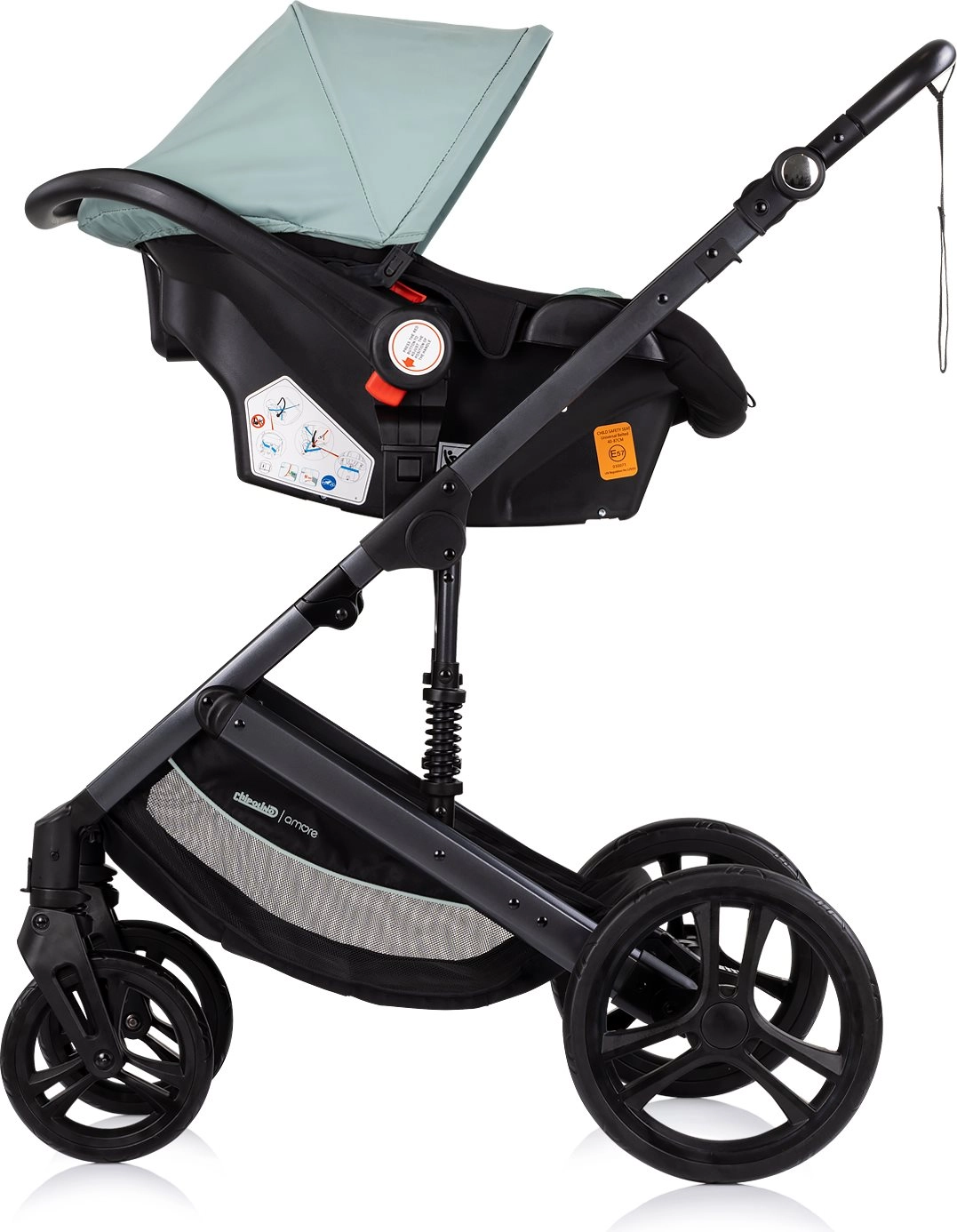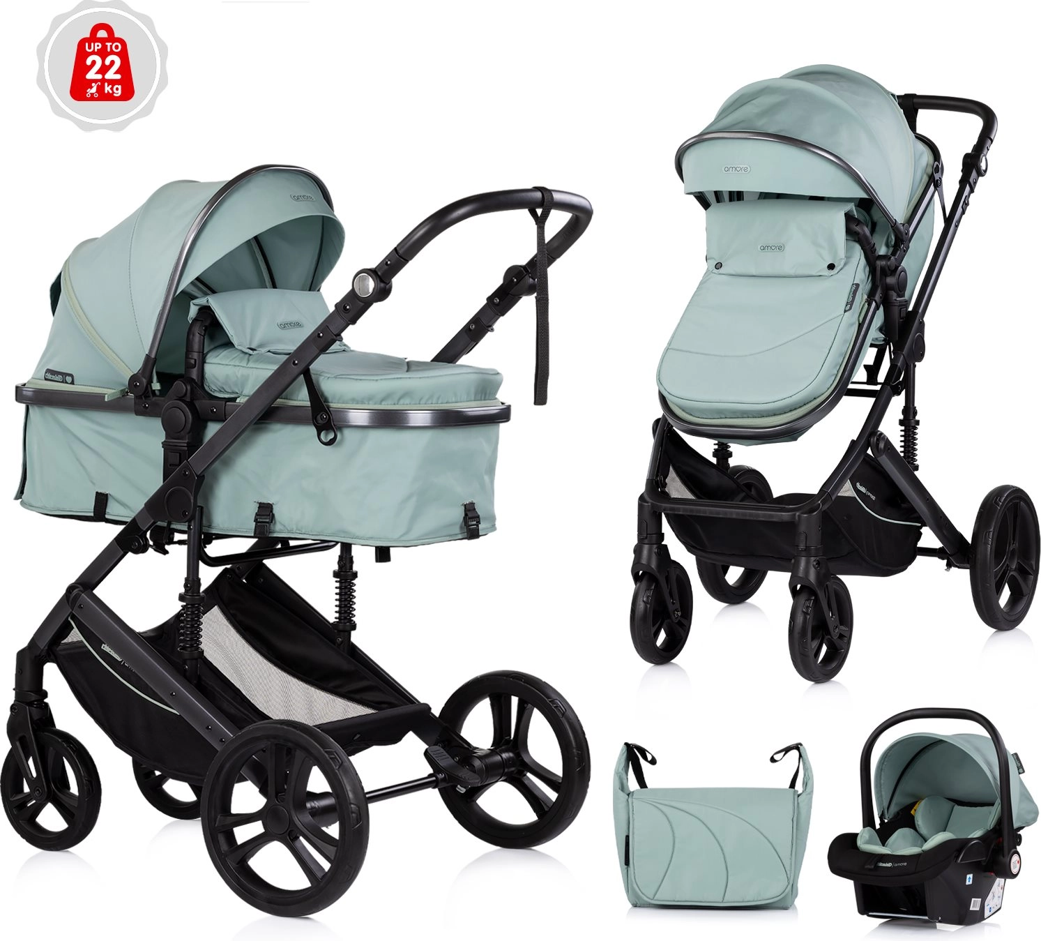 A CHIPOLINO AMORE 2 az 1-ben praktikus megoldás újszülöttek és nagyobb gyermekek számára egészen 22 kg-ig. Könnyen válthat a babának szánt mély mózeskosár és a totyogónak szánt sportfeltét között. A könnyű, mégis erős váz integrált rugózással megbirkózik a városi tereppel és a rosszabb járdákkal is, míg a nagy kupola levehető napellenzővel minden időben védi a gyermeket.