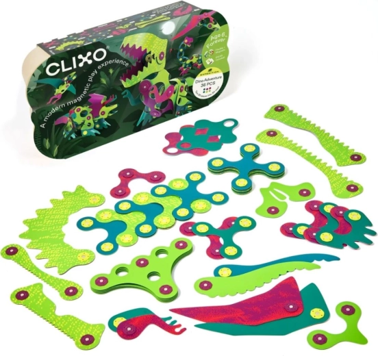 A DINO témájú Clixo mágneses építőkészlet fejleszti a kreativitást, a finommotorikát és a térbeli képzelőerőt. A beépített mágneseknek köszönhetően az elemek minden oldalról könnyen kapcsolódnak, a rugalmas szerkezet pedig lehetővé teszi síkbeli és 3D modellek készítését – a dinoszauruszoktól az egyedi, fantáziadús formákig.