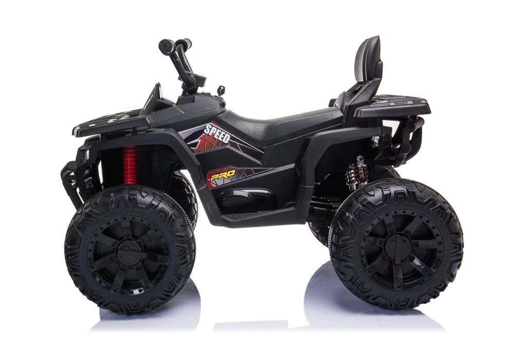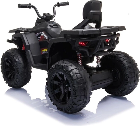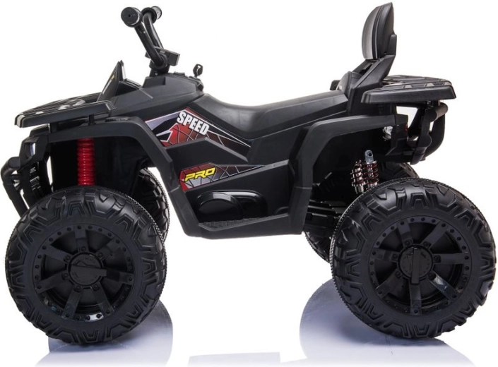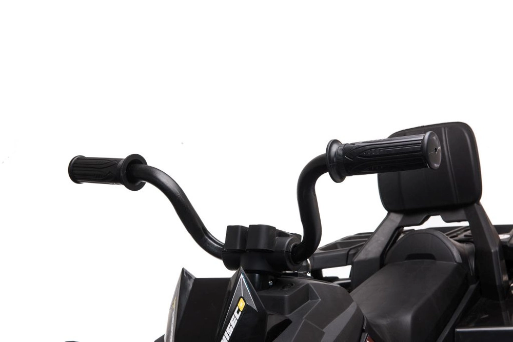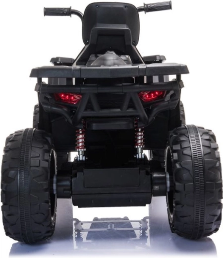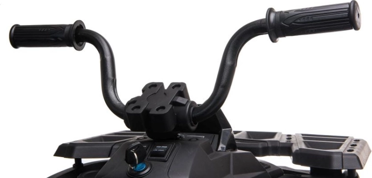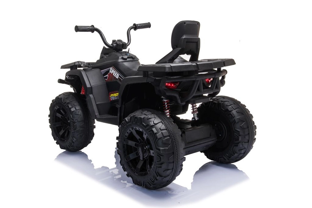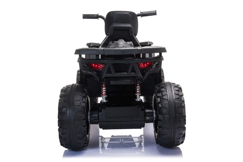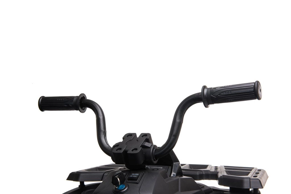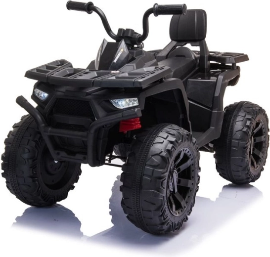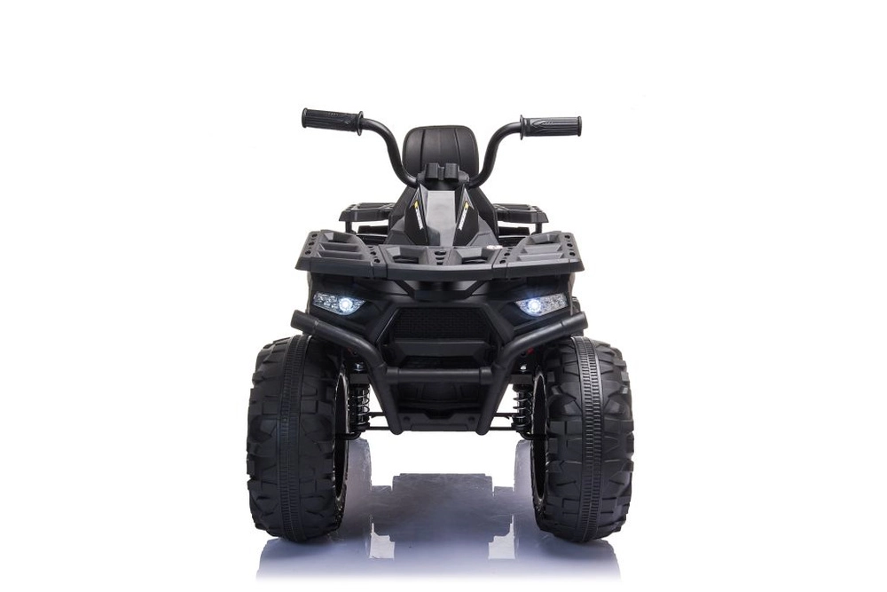 Masszív elektromos gyermek quad elegáns fekete színben, széles terepgumikkal, stabil négykerekű alvázzal és világító LED fényszórókkal a valósághű vezetési élményért. Ideális a kis kalandoroknak – kényelmes ülés háttámlával, biztonságos kezelhetőség és erőteljes terepes megjelenés, amely minden gyermeket lenyűgöz.