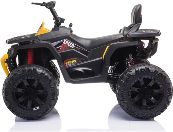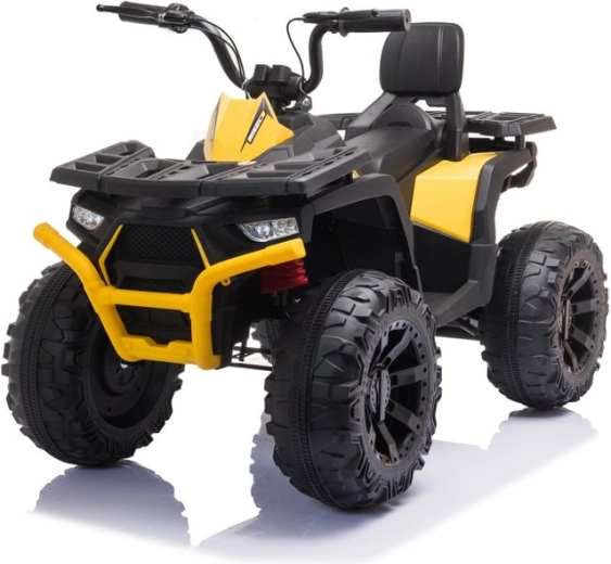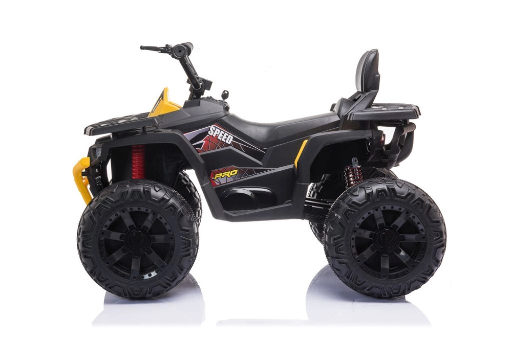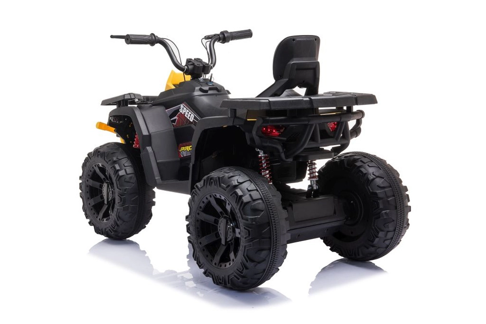 Ez a gyermek elektromos quad az ATV-k vonzó megjelenését ötvözi a praktikus funkcionalitással. A nagy, mintázott gumiknak köszönhetően megbirkózik a kert és a járda egyenetlenségeivel, míg a széles kormány és az első lökhárító biztos és biztonságos irányítást nyújt. A párnázott, háttámlás ülés hosszabb úton is kényelmet ad.