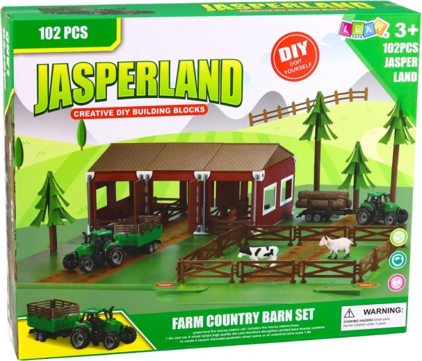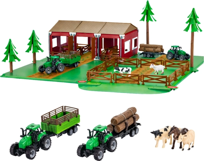 Két traktor és két pótkocsi segít a fa és más rakomány szállításában, élethűen utánozva a farmon végzett munkát. Az épületek, kerítések és traktorfülkék részletgazdag kidolgozása, valamint a minőségi műanyag tartósságot és vonzó megjelenést biztosít.