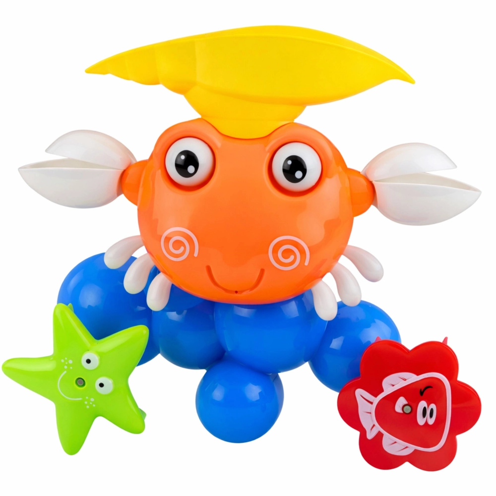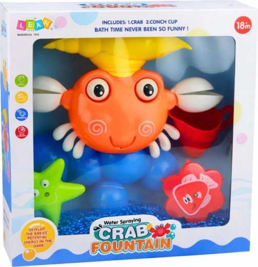 A mosolygós, színes szökőkutas rák tengeri világgá varázsolja a kádat. Elég vizet önteni a felső kagylóba, és a kerekek forogni kezdenek, a részek megmozdulnak, a rák szájából pedig apró szökőkút tör elő. A tapadókorongoknak köszönhetően a játék könnyen rögzíthető a sima csempére vagy a kádra, és stabilan tart a teljes játék alatt.