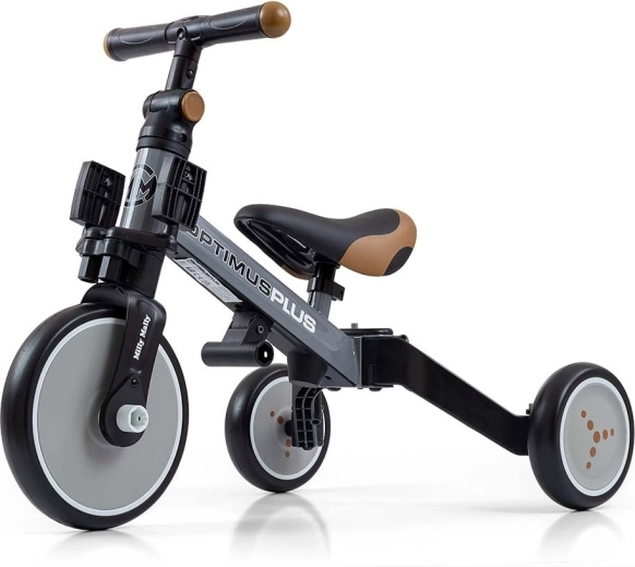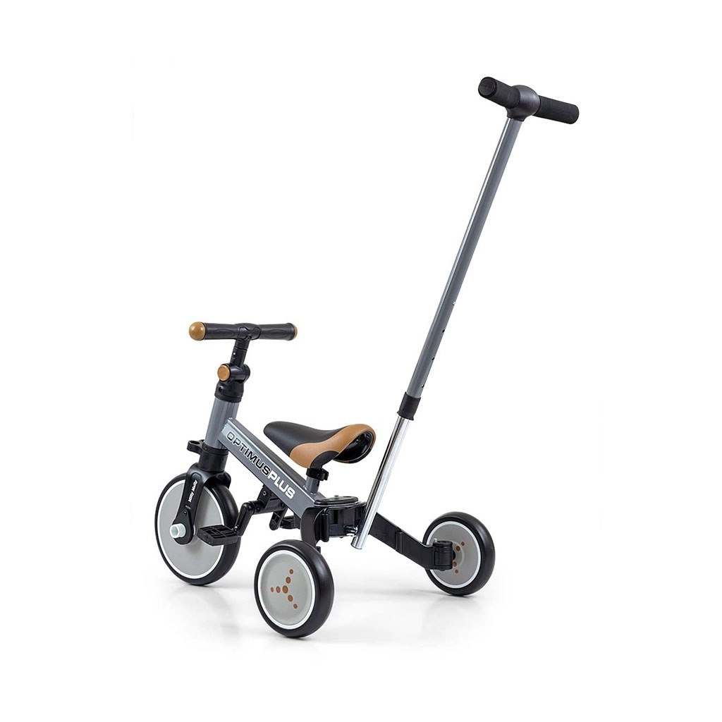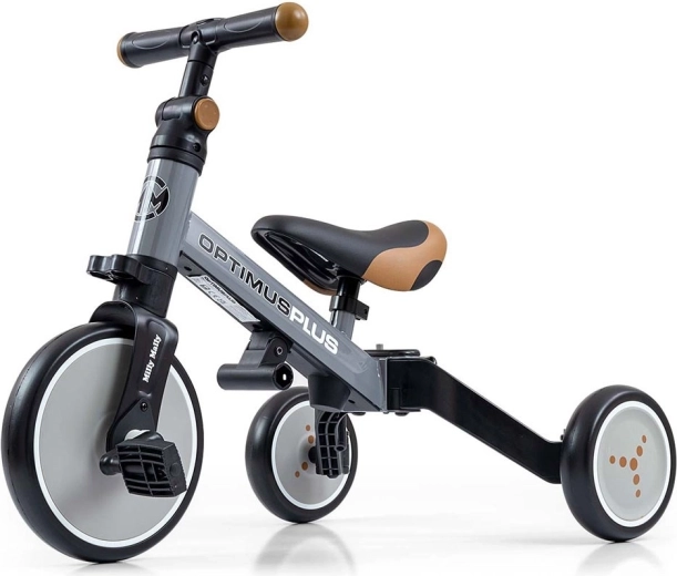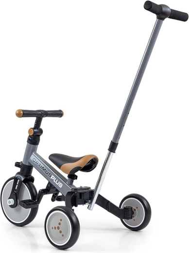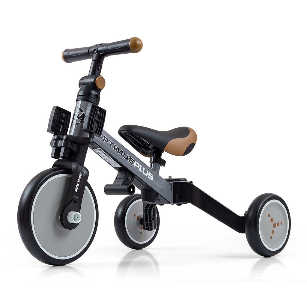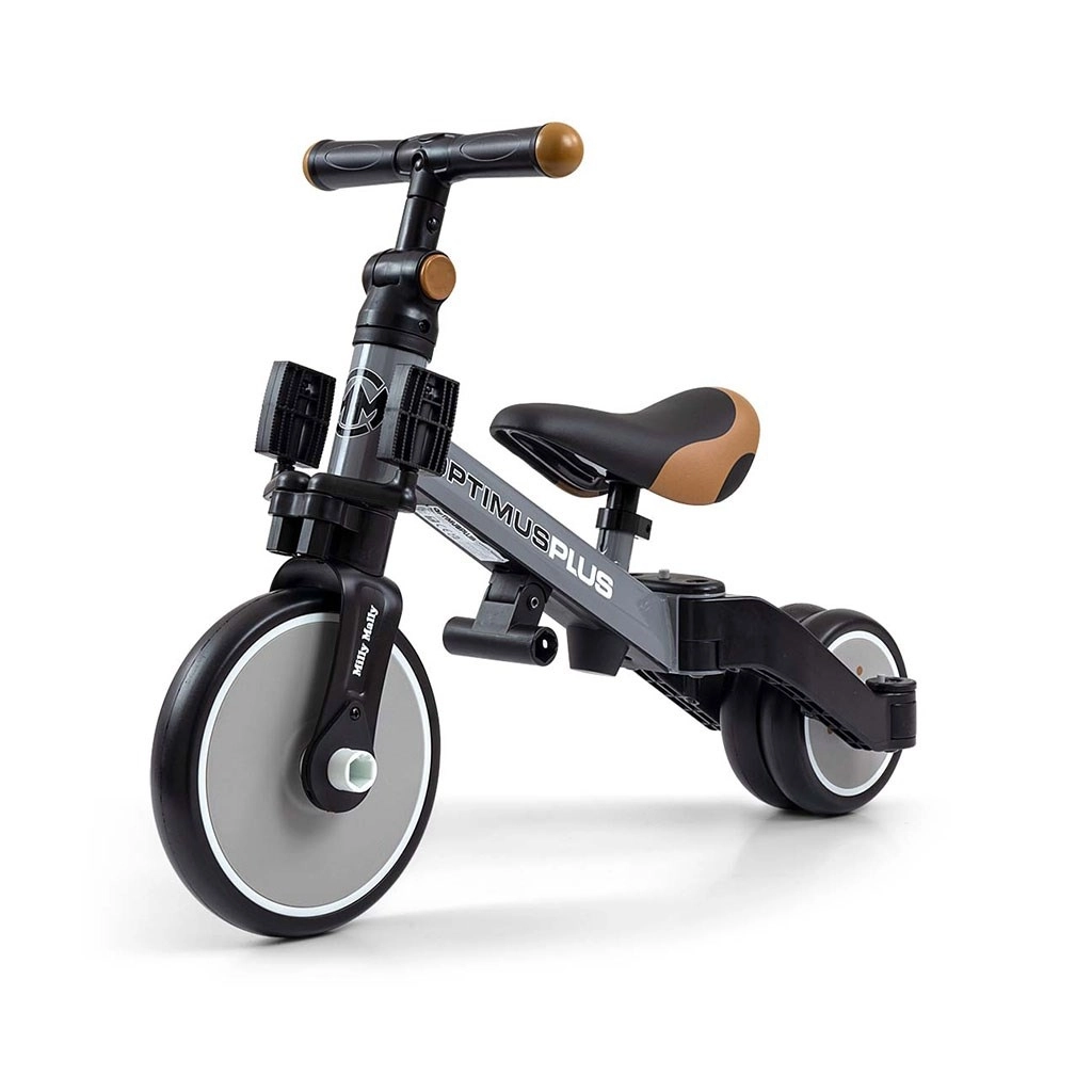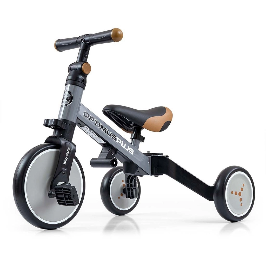 A MILLY MALLY OPTIMUS PLUS 4 az 1-ben háromkerekűt úgy tervezték, hogy megkönnyítse az első gurulásokat, és fejlessze a koordinációt és az egyensúlyt. A variálható konstrukció gyors váltást tesz lehetővé az üzemmódok között: alap, pedál nélküli háromkerekű; első kerék pedálos háromkerekű; egyszerű futóbicikli. A habkerekeknek köszönhetően a haladás csendes, kényelmes, és jó a tapadás különböző felületeken.