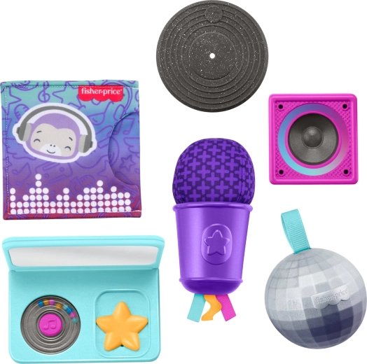 Nyomós sípoló mikrofon, diszkógömb csörgő, szilikon „hangszóró”, rágóka–lemez és zizegő tok alkotja a zenéből ihletett, érzékszervi felfedezésre és szerepjátékra ösztönző vidám szettet.
