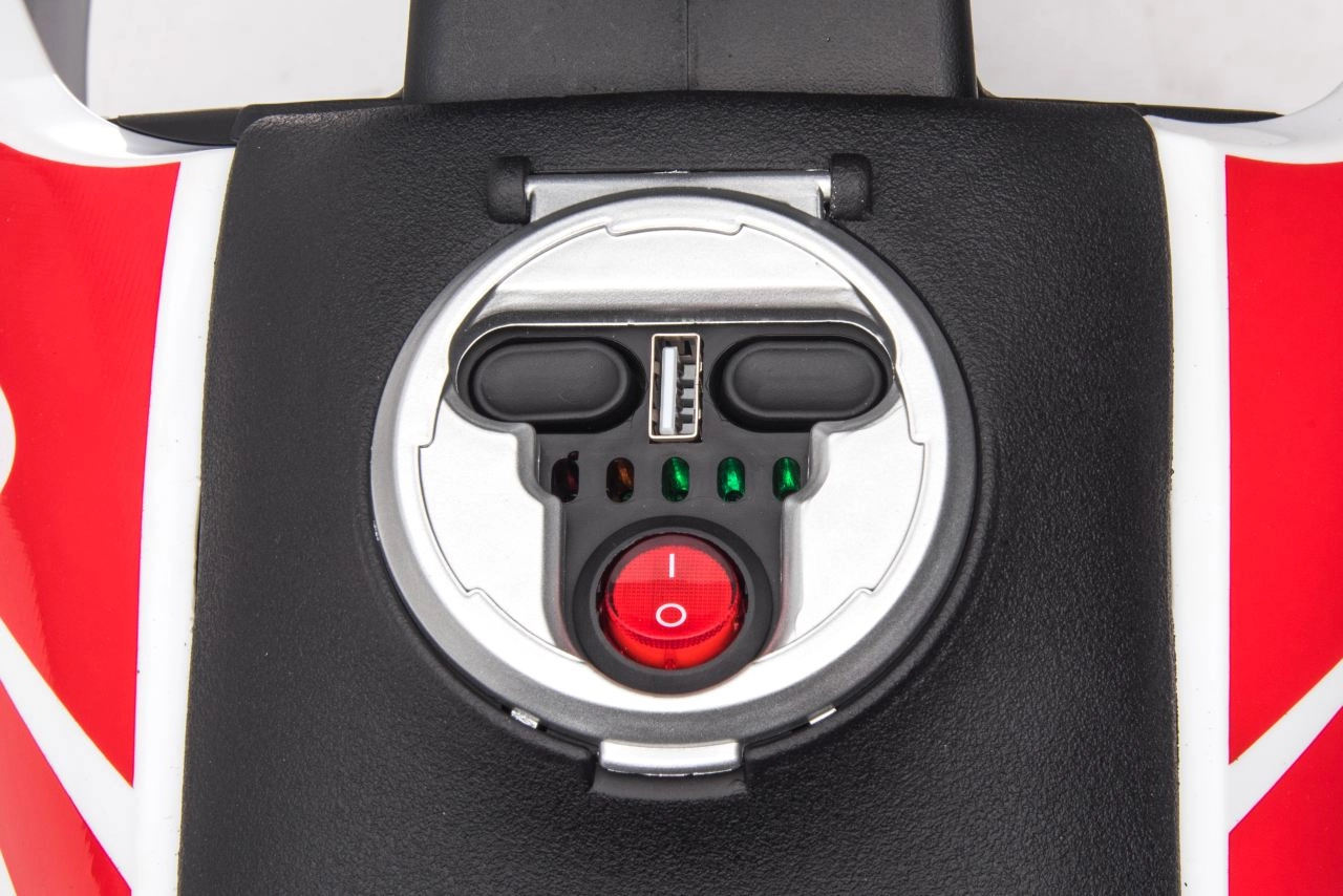 A motor modern audio panellel rendelkezik MP3, USB, Bluetooth csatlakozással és beépített dallamokkal – a kedvenc zene mindig kéznél lesz útközben. A 2x35 W teljesítményű hajtás, melyet a 12 V 7 Ah akkumulátor táplál, elegendő erőt biztosít akár kerti használathoz is. Az első LED lámpák növelik a láthatóságot és vonzó megjelenést kölcsönöznek.