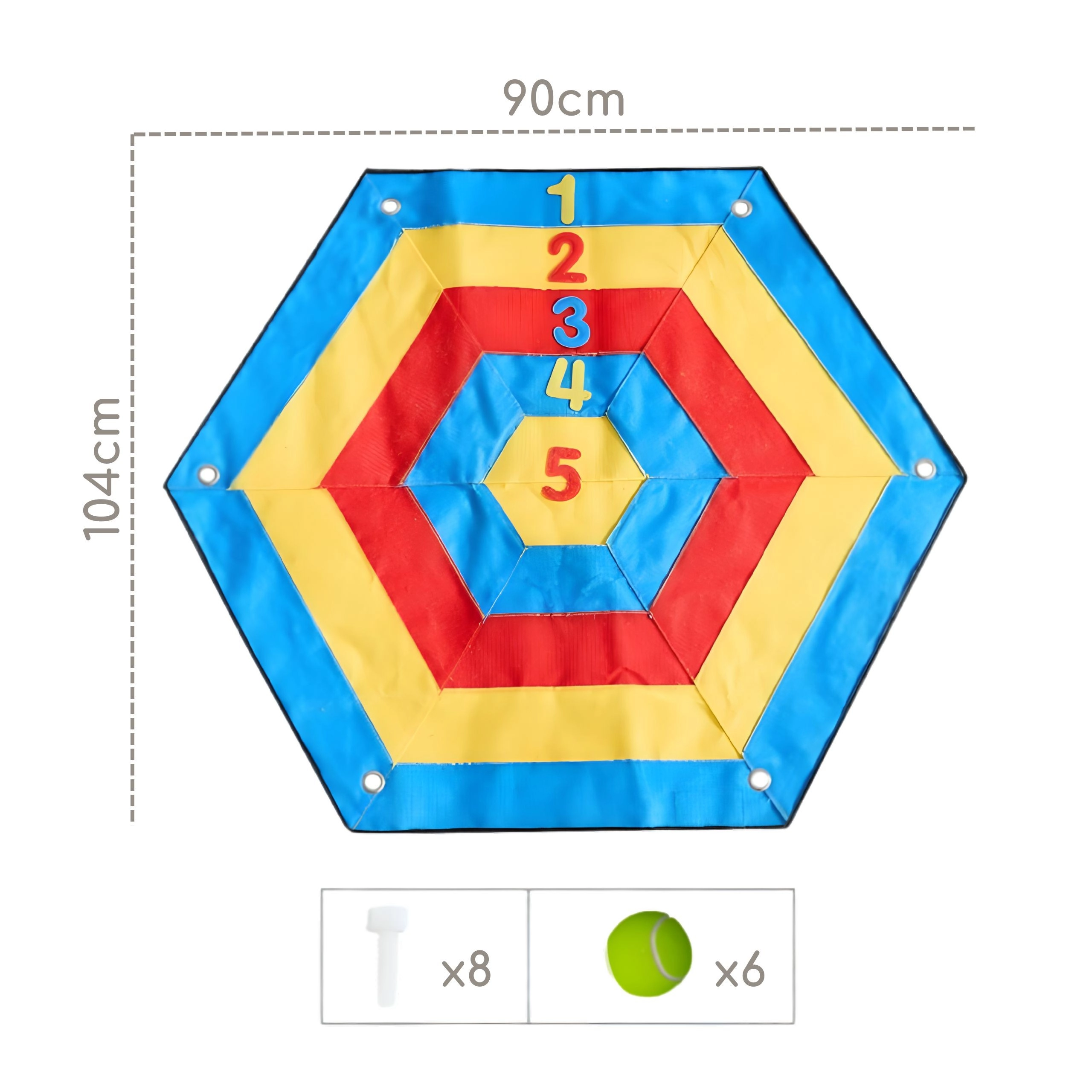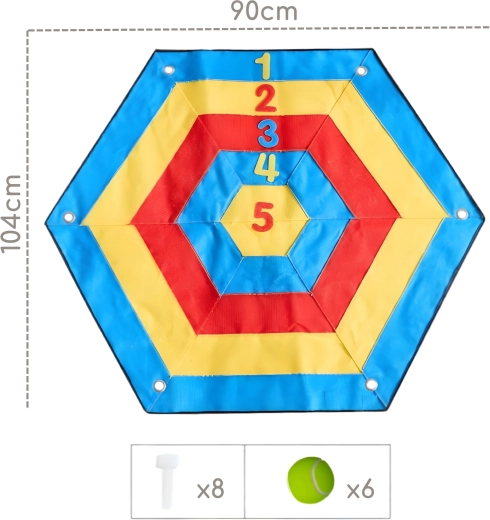 A hatszögletű célpont élénk színeivel és számozott mezőivel játékra csábít, és támogatja a pontosságot és a koncentrációt.