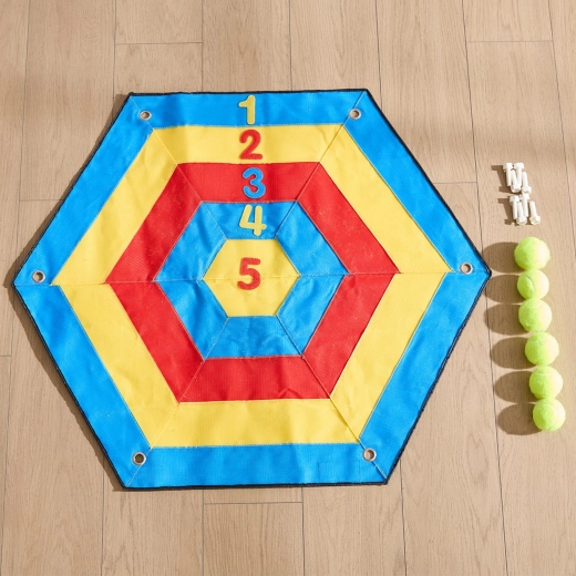Változtasd a számolást akciódússá! A nagy hatszögletű célszőnyeg akasztófülekkel biztonságos és lebilincselő játékra készült: a gyerekek puha, tépőzáras labdákat dobnak a számozott mezőkre és pontokat gyűjtenek. A könnyű kialakítás gyors felakasztást tesz lehetővé falra vagy táblára, és kültéren is használható.