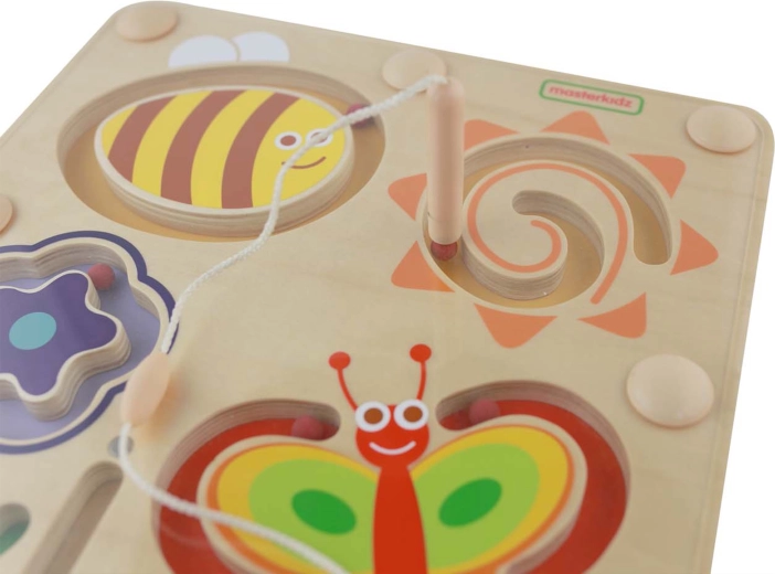 A mágneses útvesztővel ellátott fa aktivitástábla szórakoztató módon segíti a mozdulatok pontosságának és a koncentrációnak a gyakorlását. A mellékelt mágneses „varázs” stylussal a gyerekek a kimart ösvényeken tologatják a golyókat, miközben a rovarok, virágok és a nap színes illusztrációit követik. Így természetes módon fejlesztik a finommotorikát, a kéz–szem koordinációt és a logikus gondolkodást.