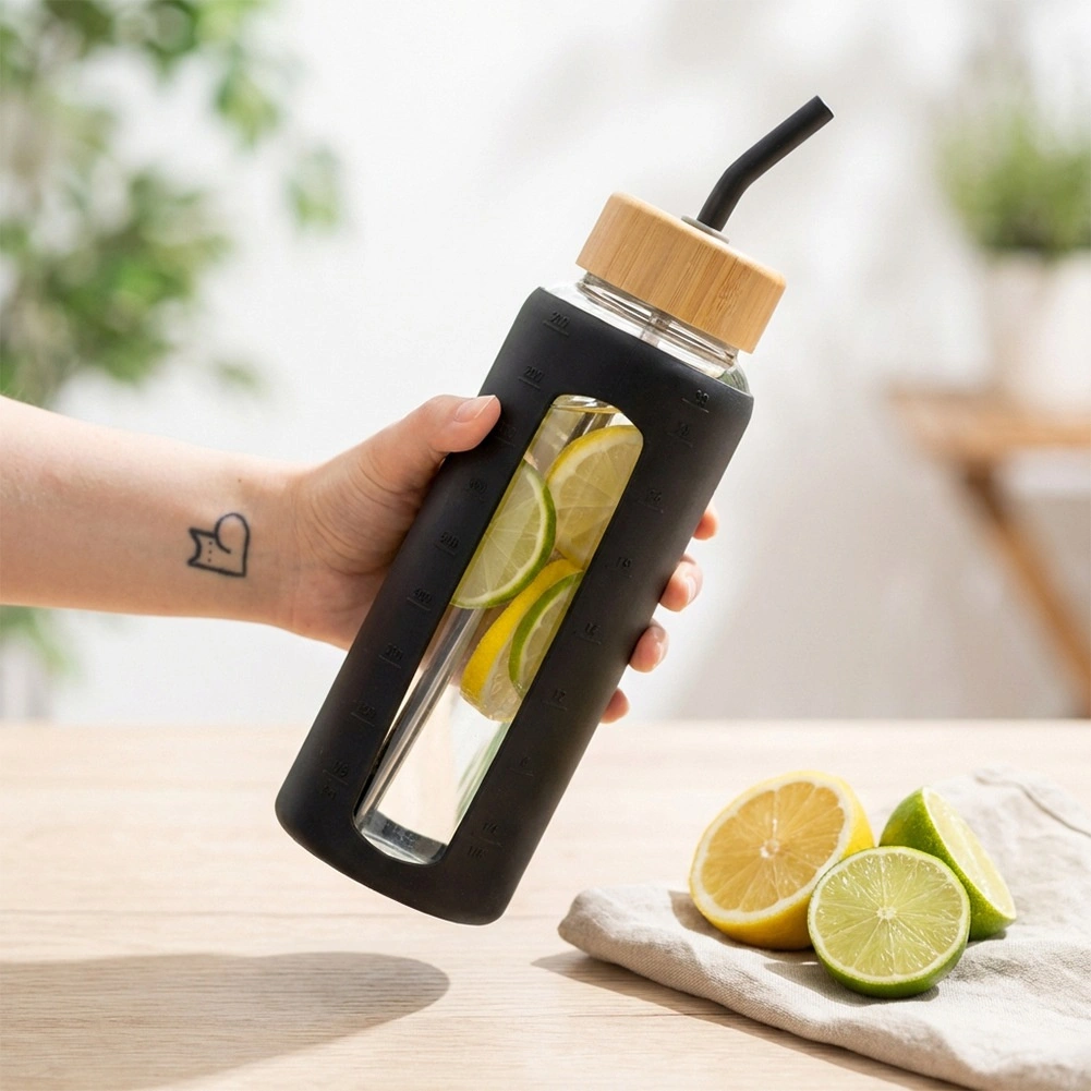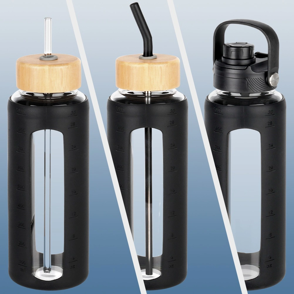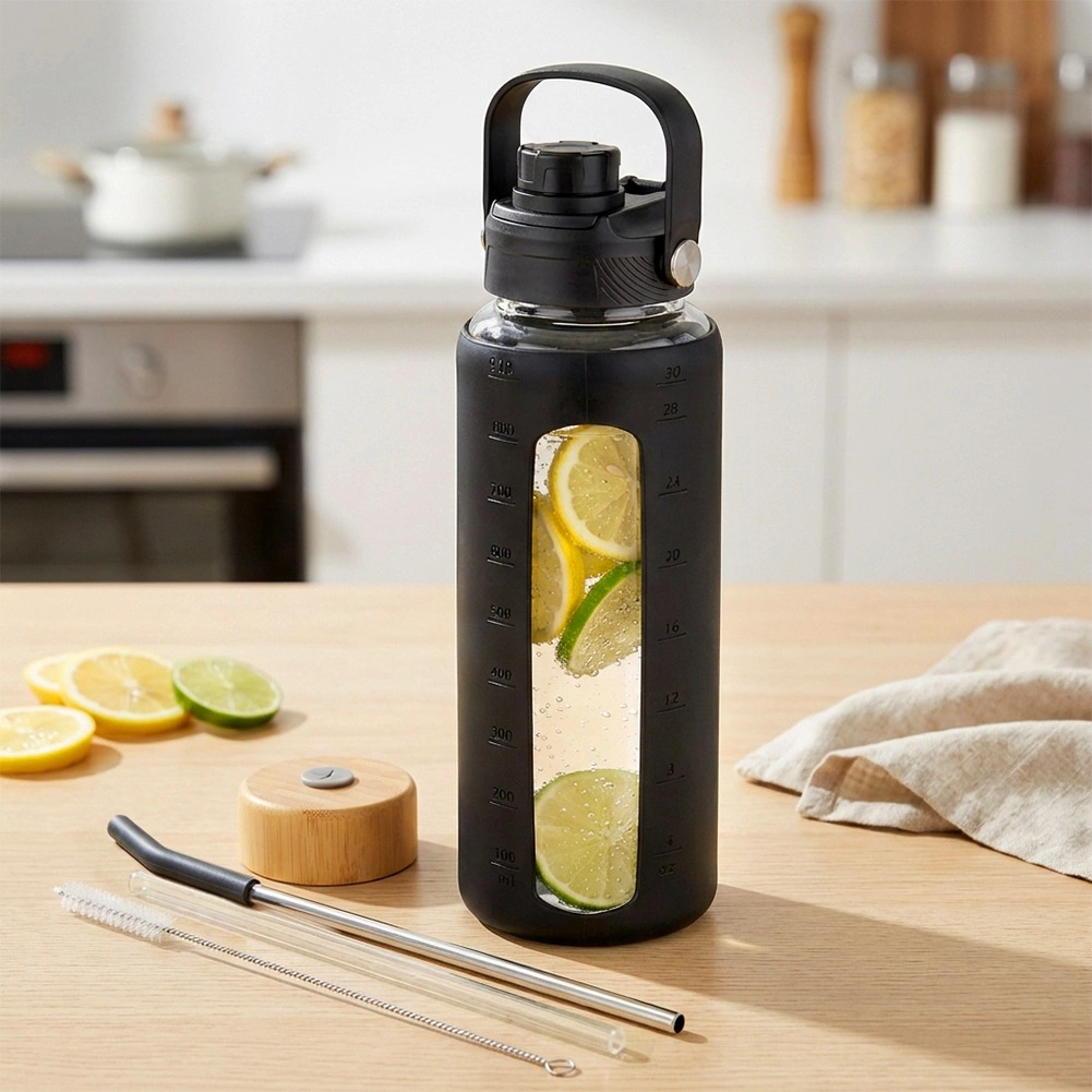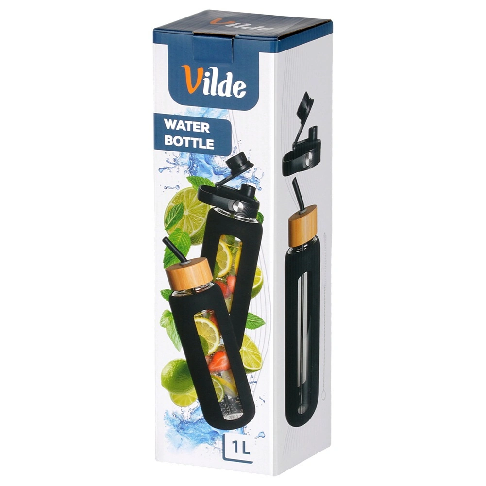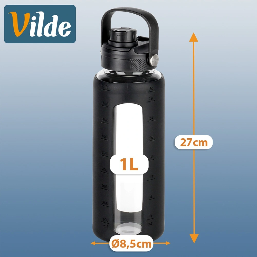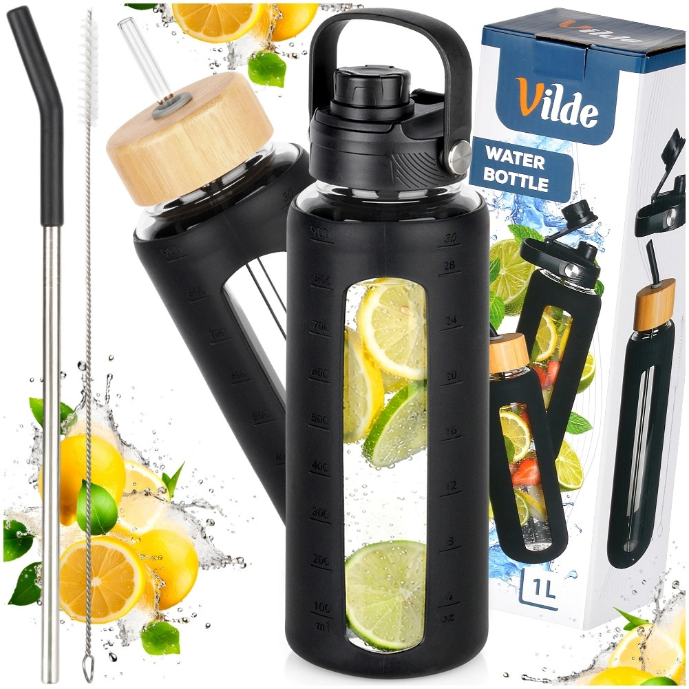 Praktikus, 1 literes üvegpalack strapabíró boroszilikát üvegből, csúszásmentes szilikon borítással és két cserélhető kupakkal szopókás iváshoz vagy szívószállal. Az áttekinthető mérce segít követni a folyadékbevitelt, a széles nyak pedig megkönnyíti a töltést és a tisztítást. Ideális munkába, sporthoz, utazáshoz és otthonra.