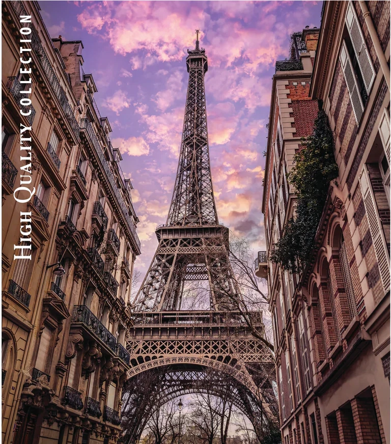Az Eiffel-torony részletes látképe párizsi házak között, finom rózsaszín hajnali tónusokkal, eleganciát és utazós hangulatot kölcsönöz az enteriőrnek.