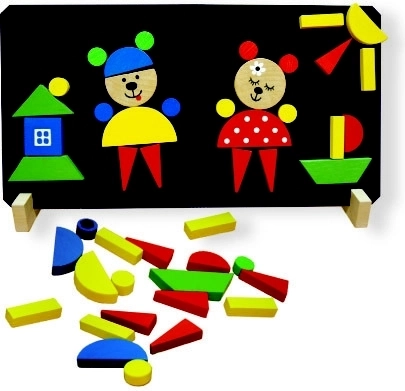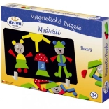 Mágneses puzzle Medvék szórakoztató és kreatív módot kínál a finommotoros készségek és a gyerekek képzelőerejének fejlesztésére. A készlet tartalmaz egy mágneses táblát és 37 fa darabkát, amelyekből különféle képeket lehet létrehozni.