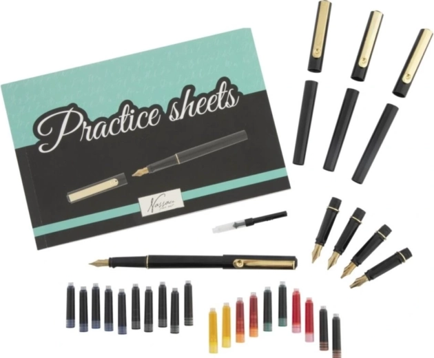 A csomagban mindent megtalál, amire a gyakorláshoz és a végső alkotásokhoz szükség van – az öt elegáns tolltól a cserélhető hegyeken át a praktikus gyakorlófüzetig a technika fokozatos tökéletesítéséhez. A készlet kényelmes írást, egyenletes tintafolyást és tiszta vonalakat biztosít.