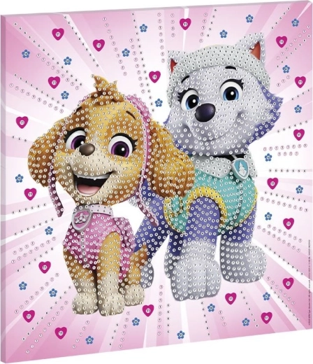 Fedezd fel a gyémántszemes festés varázsát, és készíts saját csillogó képet a kedvelt PAW Patrol hősökkel. A 30 × 30 cm-es vászon előre nyomtatott és számozott mezőkre osztott, így könnyen látod, melyik kő hová illik. Ez a kreatív szett ideális nyugodt pihenőpercekhez és a finommotorika fejlesztéséhez.
