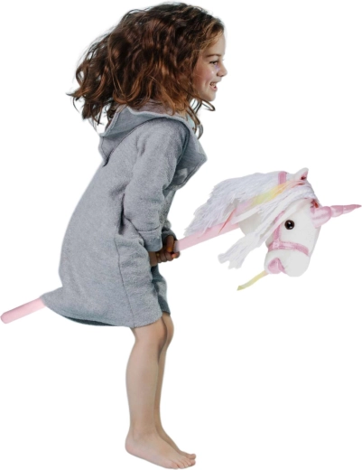 Ez a rúdlovas unikornis támogatja a mozgást, a fantáziát és a szerepjátékot. A puha plüss kellemes tapintású, a díszes sörény és szalagok pedig varázslatos hangulatot kölcsönöznek minden lovaglásnak. A fülben lévő gomb megnyomására élethű vágtázás- és nyerítés-hangok hallhatók, amelyek még valóságosabbá teszik a lovas játékot.