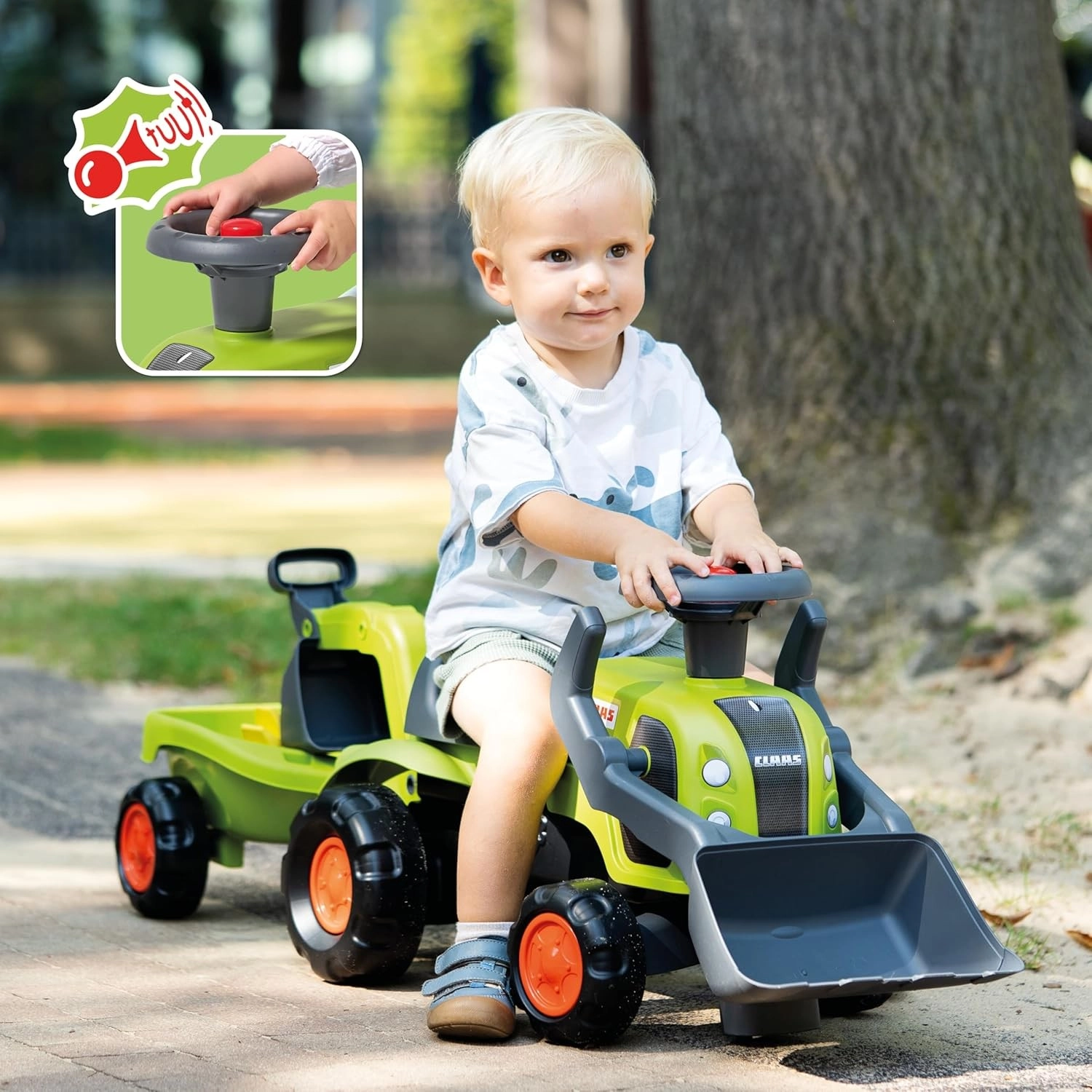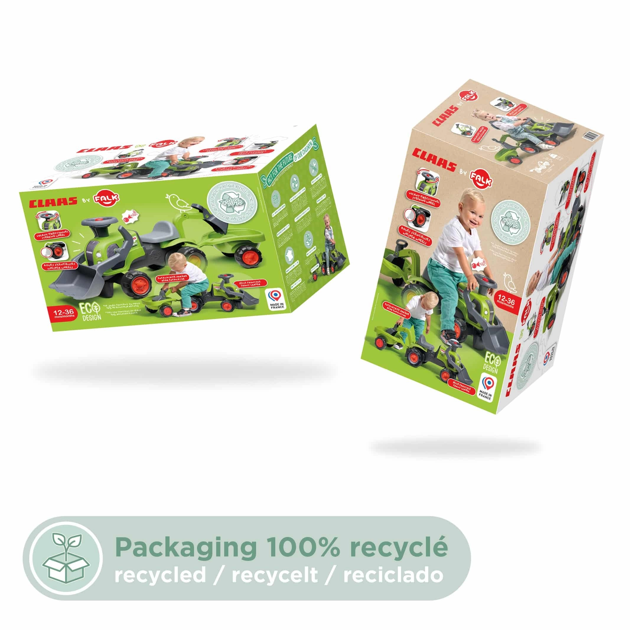A licencelt FALK CLAAS tolható traktor masszív és biztonságos jármű a legkisebb építőknek 1 éves kortól. Franciaországban készült, 90% újrahasznosított műanyagból, és működő első kanállal, hátsó markoló karral valamint levehető pótkocsival kínál végtelen szórakozást otthon és a kertben. A irányítható kormány dudával, a stabil kerekek és az ergonomikus ülés gondoskodnak a kényelemről és a vezetés öröméről.
