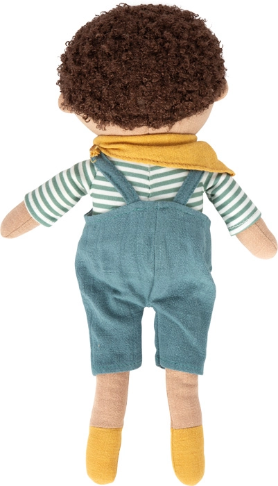 A baba puha textíliákból készült, hímzett arcrészletekkel – apró alkatrészek nélkül, így a legkisebbek számára is alkalmas.