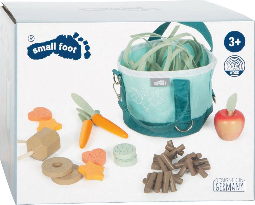 - Teljes játékkészlet: textil vödör/táska, fa alma, répák, „kekszek”, „pellet”, „széna” és további kiegészítők.