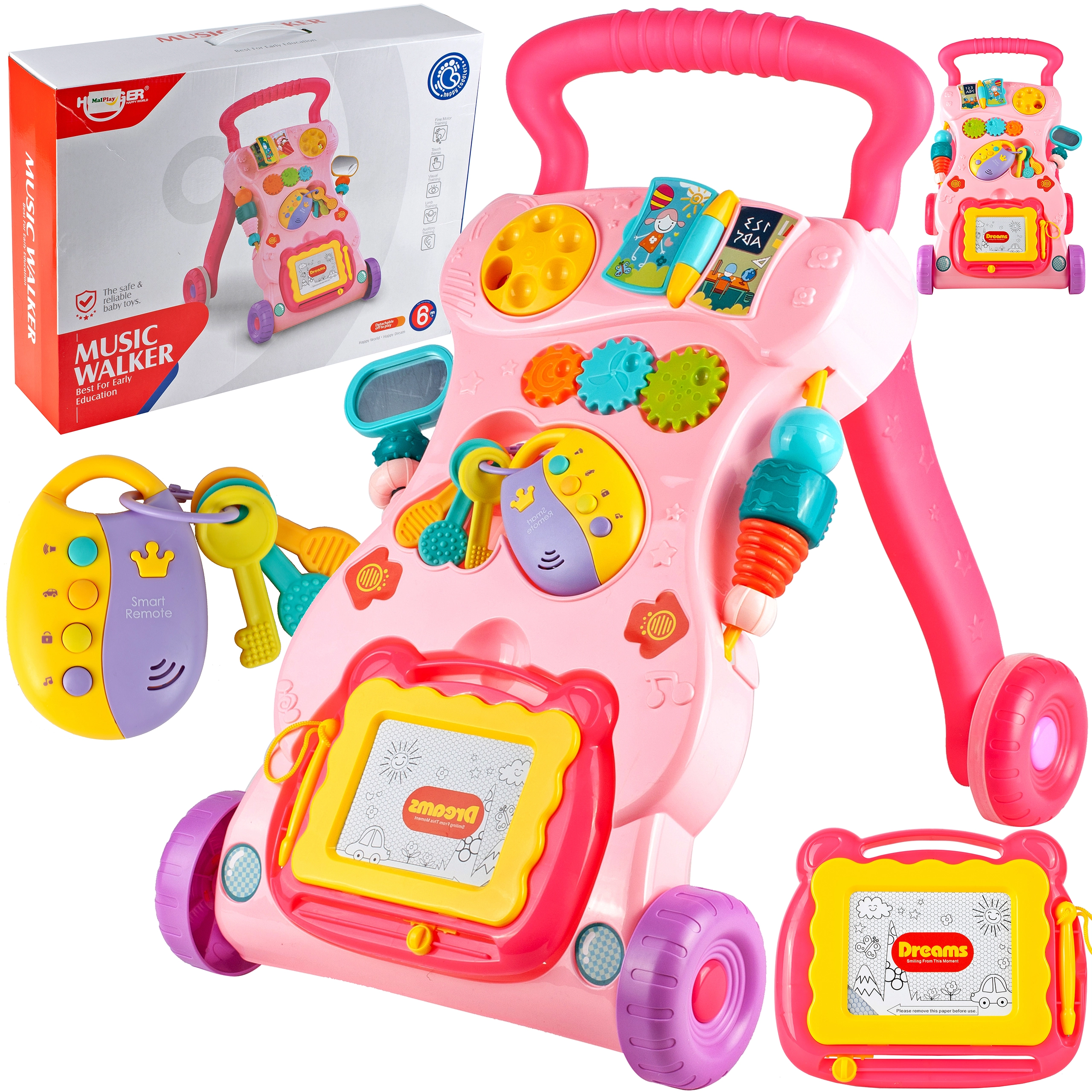 Praktikus, rózsaszín járássegítő 6 hónapos kortól, amely ötvözi az első lépésekhez szükséges stabil támaszt az interaktív szórakozással. Betűtáblát és kulcsokat kínál a finommotorika fejlesztésére, 12 dallamot az érzékszervi stimulációhoz, valamint műanyag kerekeket hátsó gumírozott réteggel a halkabb és biztonságosabb haladásért. Ideális választás játékos tanuláshoz és mindennapi járástréninghez.