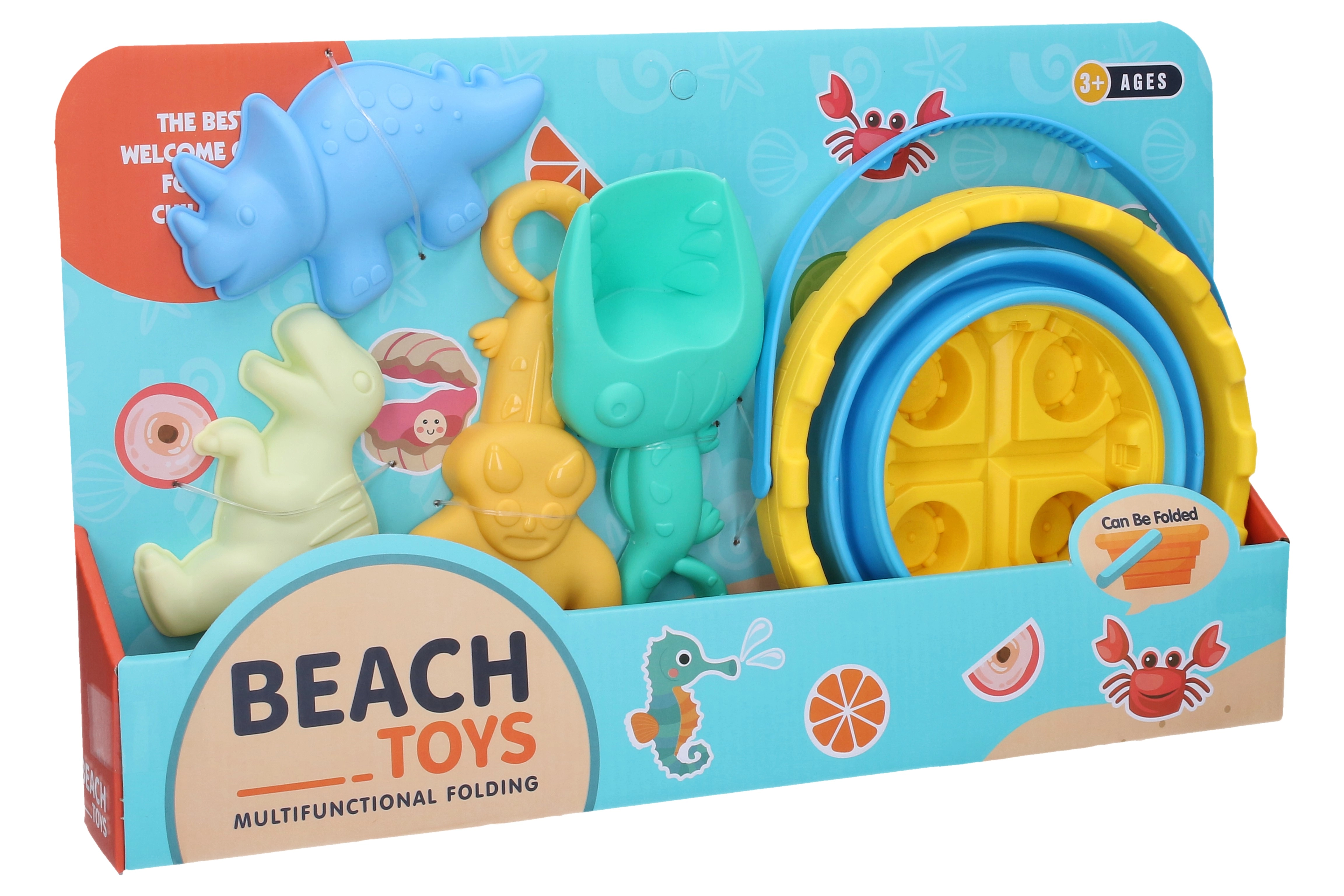 Szórakoztató, dinoszaurusz témájú gyerek homokozókészlet összecsukható vödörrel, lapáttal, gereblyével és két formával. Tökéletes a strandra és a játszótérre – könnyű, tartós és könnyen tisztítható. Fejleszti a finommotorikát, támogatja a kreativitást, és végtelen szórakozást nyújt a szabadban.