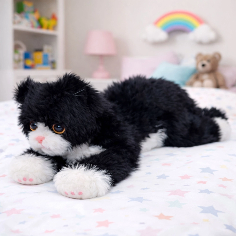 A bájos, fekete–fehér plüssmacska puha, selymes tapintású és kész az összebújáshoz. A valósághű kidolgozásnak, a finom szőrnek és a biztonságos, kellemes anyagoknak köszönhetően a gyerekek gyorsan megszeretik, játékhoz és alváshoz egyaránt ideális társként.
