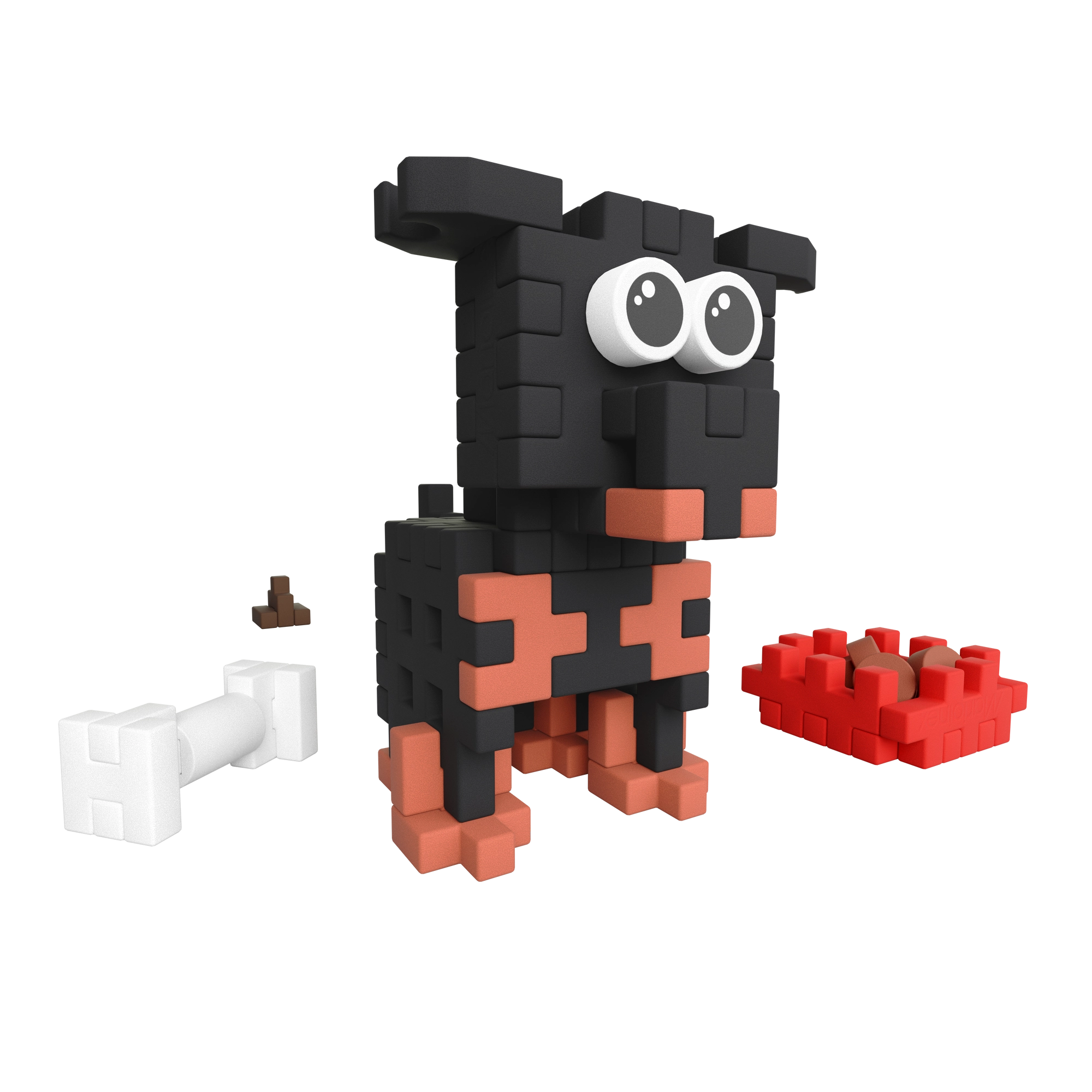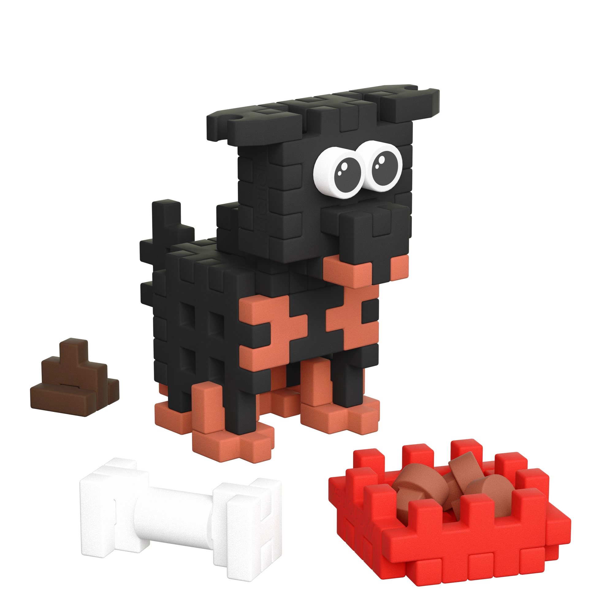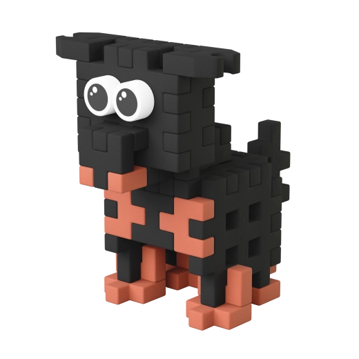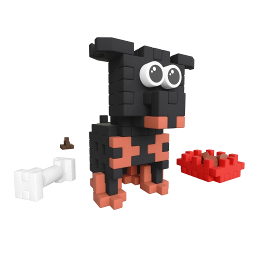 Építsen meg egy stílusos kutyust nagy szemekkel és kiegészítőkkel – tálka táppal, csont és „kaki”. Remek alap a gyerekek történetmesélős játékához.