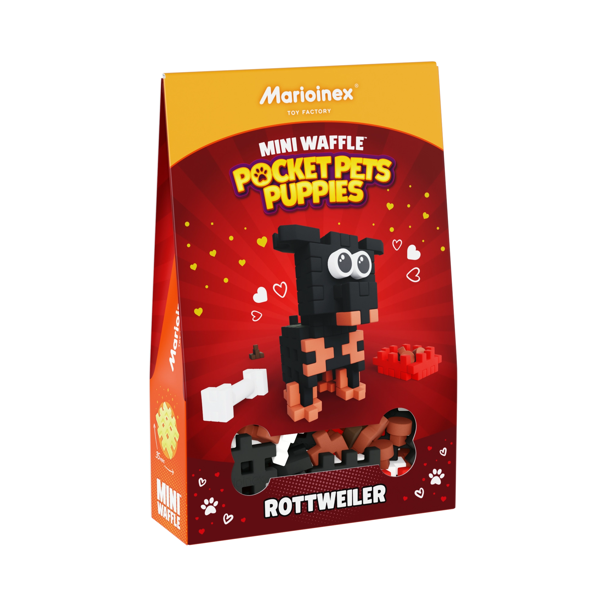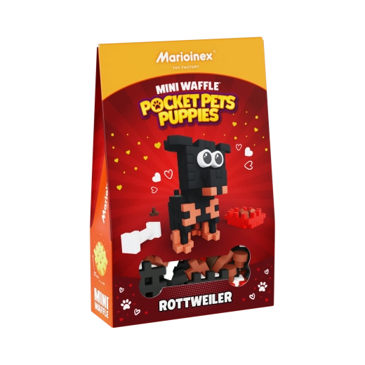 Fedezze fel a MARIOINEX Mini Waffle Pocket Pets szórakoztató építőkészletét egy aranyos rottweiler témával. A kompakt csomagolásban 50 színes elem található egy kutyus figura és kiegészítők megépítéséhez – tálka táppal, csont és kaki. Az elemek könnyen kapcsolódnak, rugalmasak, tartósak és biztonságosak, így a gyerekek 2D-ben és 3D-ben is alkothatnak, fejlesztve a kreativitást, a finommotorikát és a logikus gondolkodást.