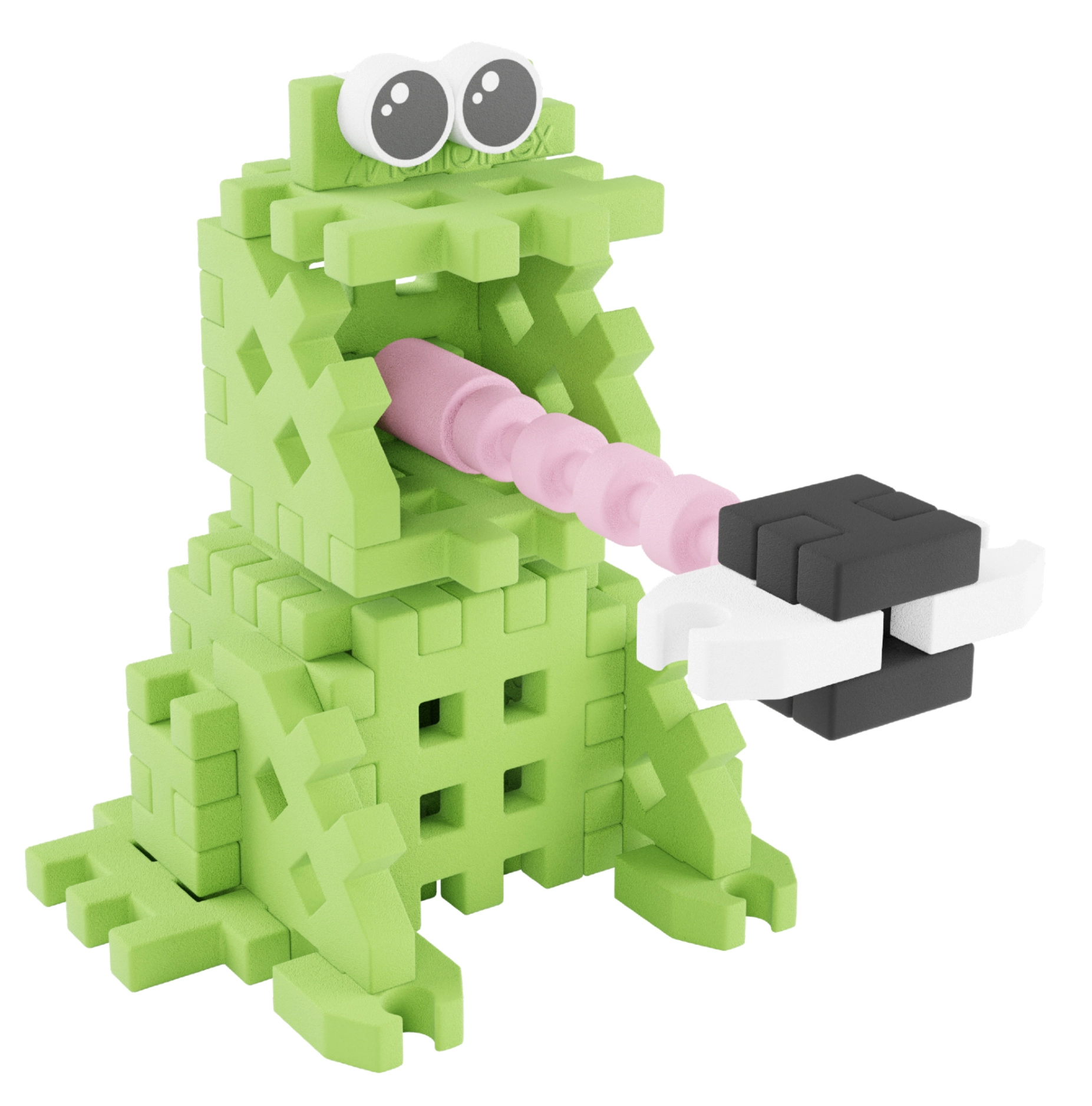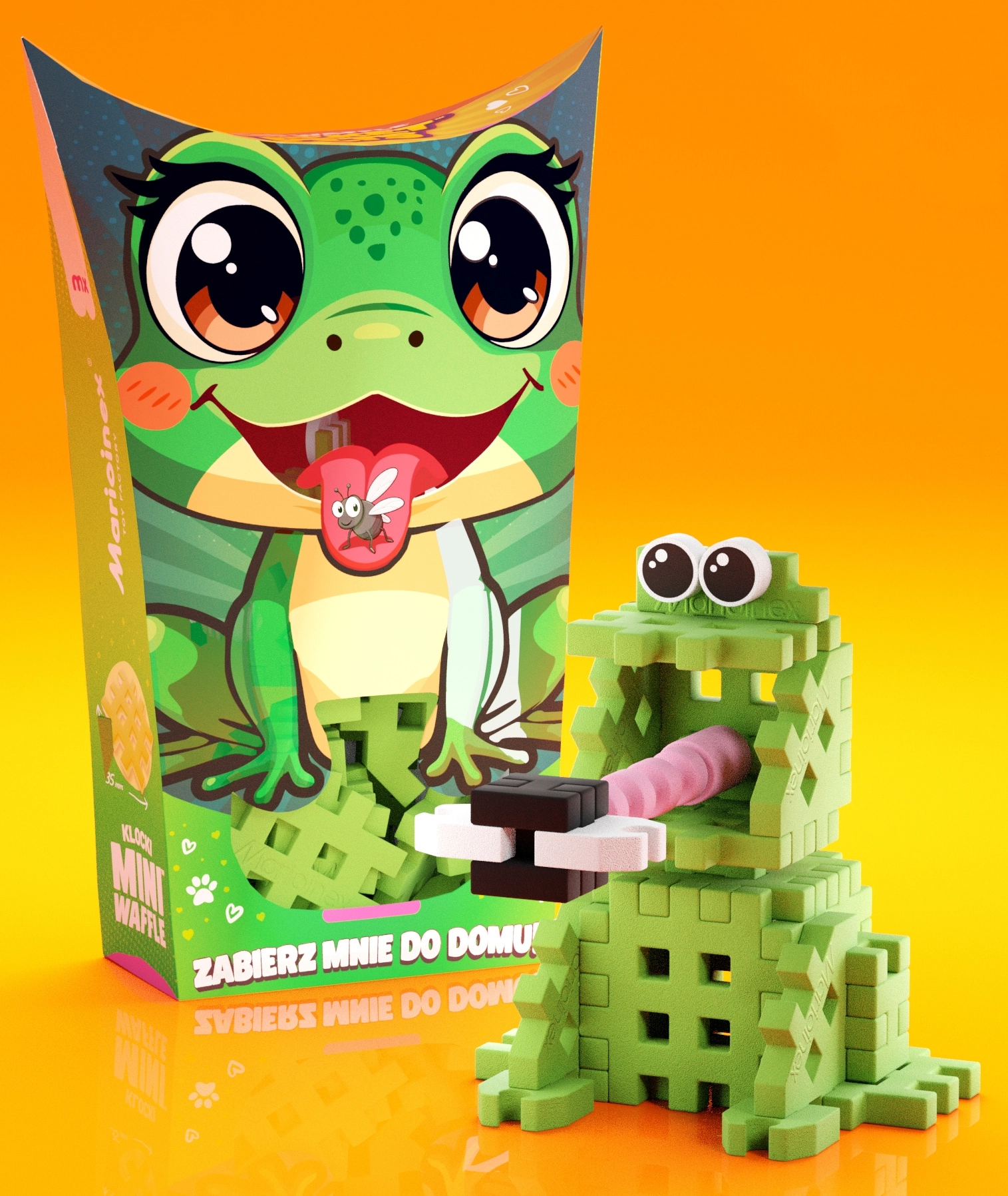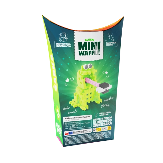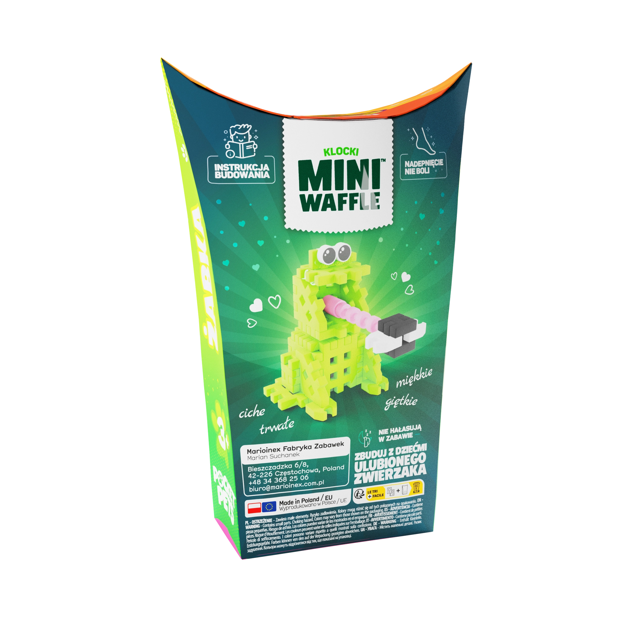 A Mini Waffle Pocket Pets – béka építőkészlet ideális választás a kis építők számára. A gyerekek a 34 elemből saját békájukat rakhatják össze, amely hőse lehet a történeteiknek, vagy a Pocket Pets sorozat nagyobb állatgyűjteményének része. A 2D és 3D építés lehetőségének köszönhetően természetes módon fejlődik a képzelet és a türelem.