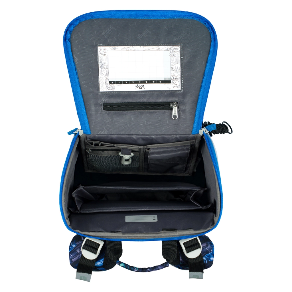 Felnyitható nyitórendszer, belső rendező gumipánttal, órarendnek szánt zseb és praktikus rekeszek segítik a rendtartást és gyors tájékozódást.