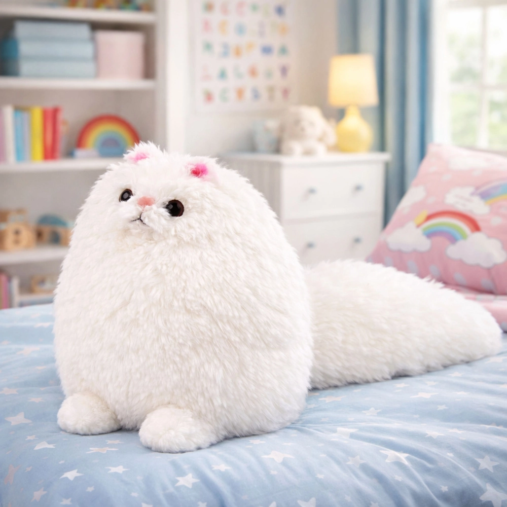 Ez a fehér plüss cica kerek, pelyhes formájával és különlegesen hosszú farkával tűnik ki, ami egyedi bájt kölcsönöz a játéknak. A selymes plüss ölelésre csábít, és maximális kényelmet biztosít alvás és relaxáció közben is.