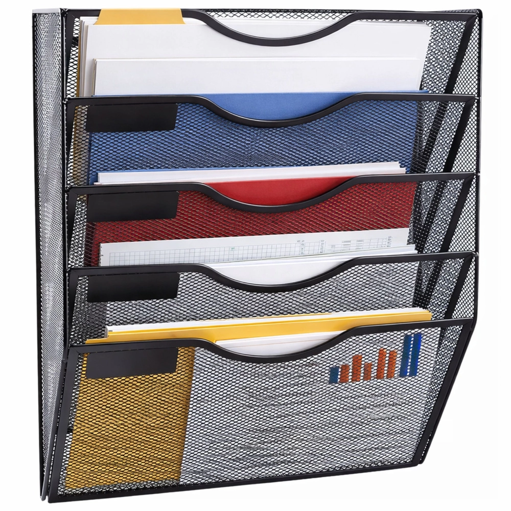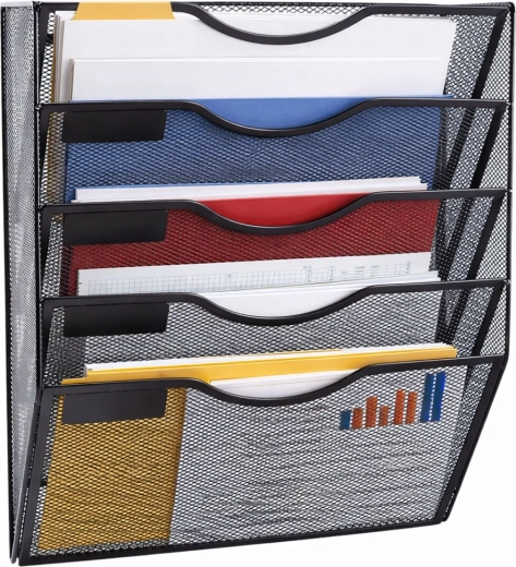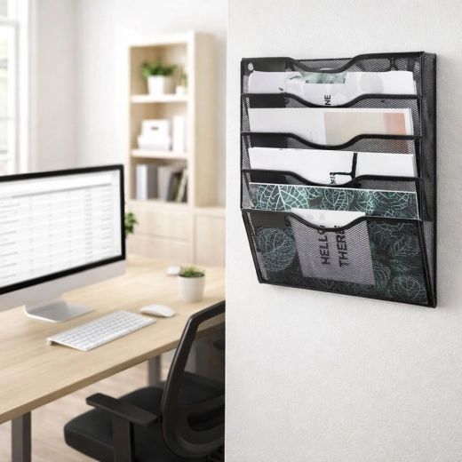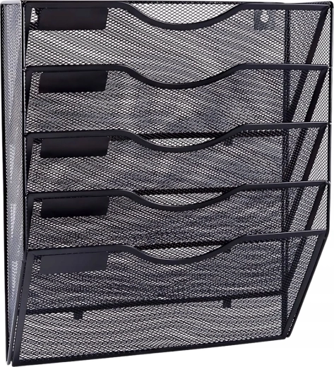 Spóroljon helyet az asztalon, és tartson mindent kéznél ezzel a fémszövetből készült fali iratrendezővel. 5 tágas A4-es zseb, strapabíró, porszórt felületű kivitel és címketartók a gyors jelöléshez – ideális dokumentumok, levelek és magazinok rendszerezéséhez.