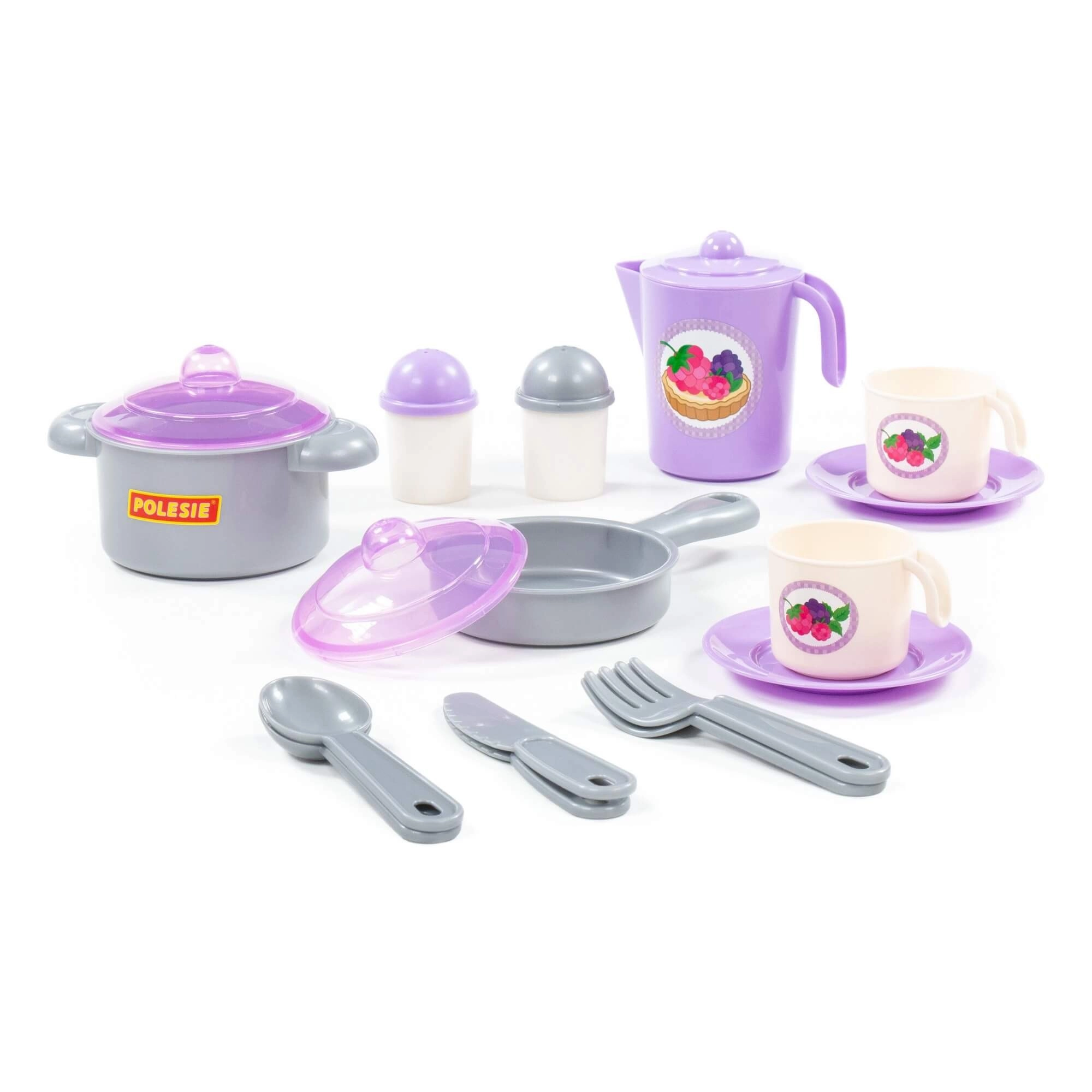 A készlet csészéket csészealjakkal, tányérokat, evőeszközöket, kancsót és fedeles edényeket tartalmaz – a gyerekek úgy tálalhatnak és „főzhetnek”, mint a felnőttek.