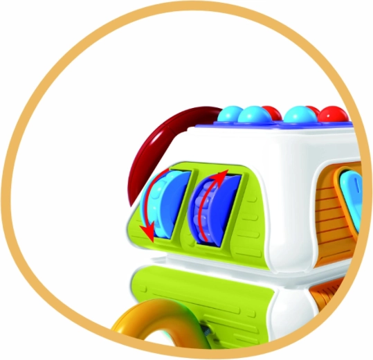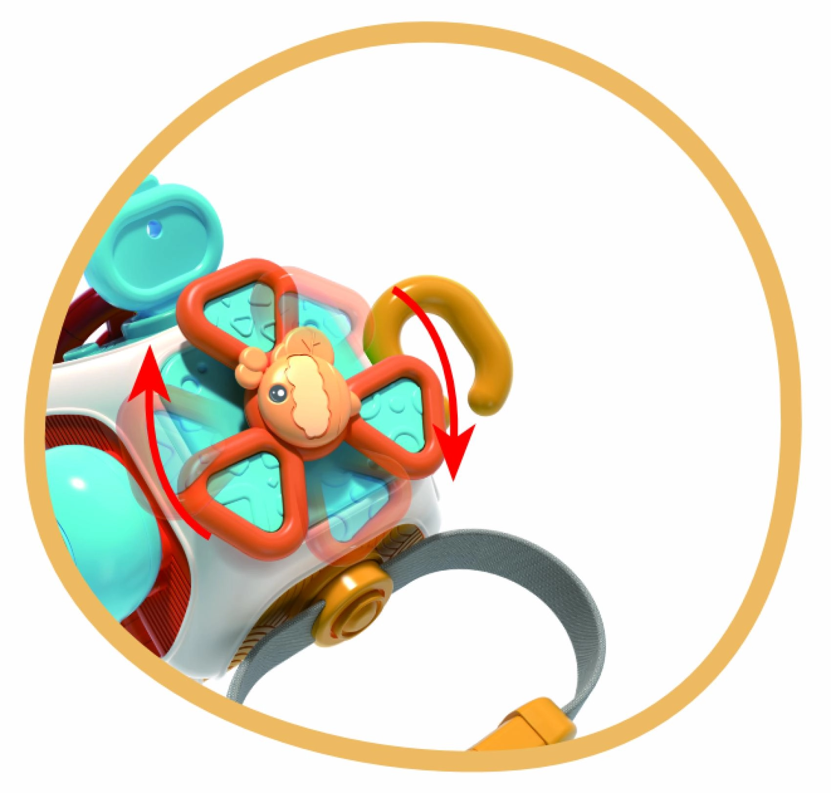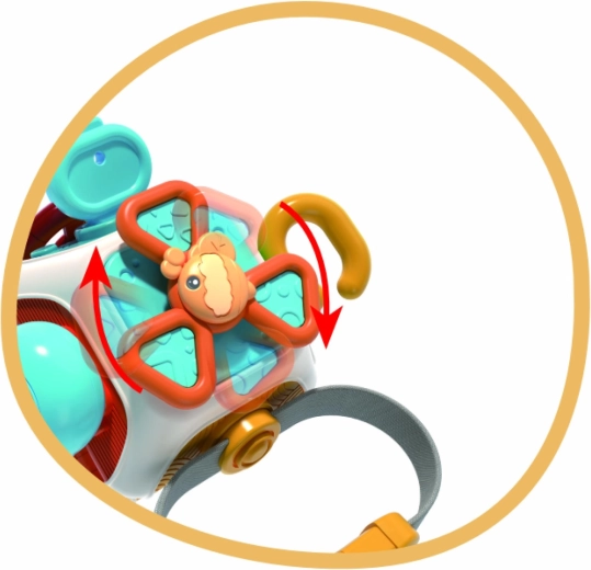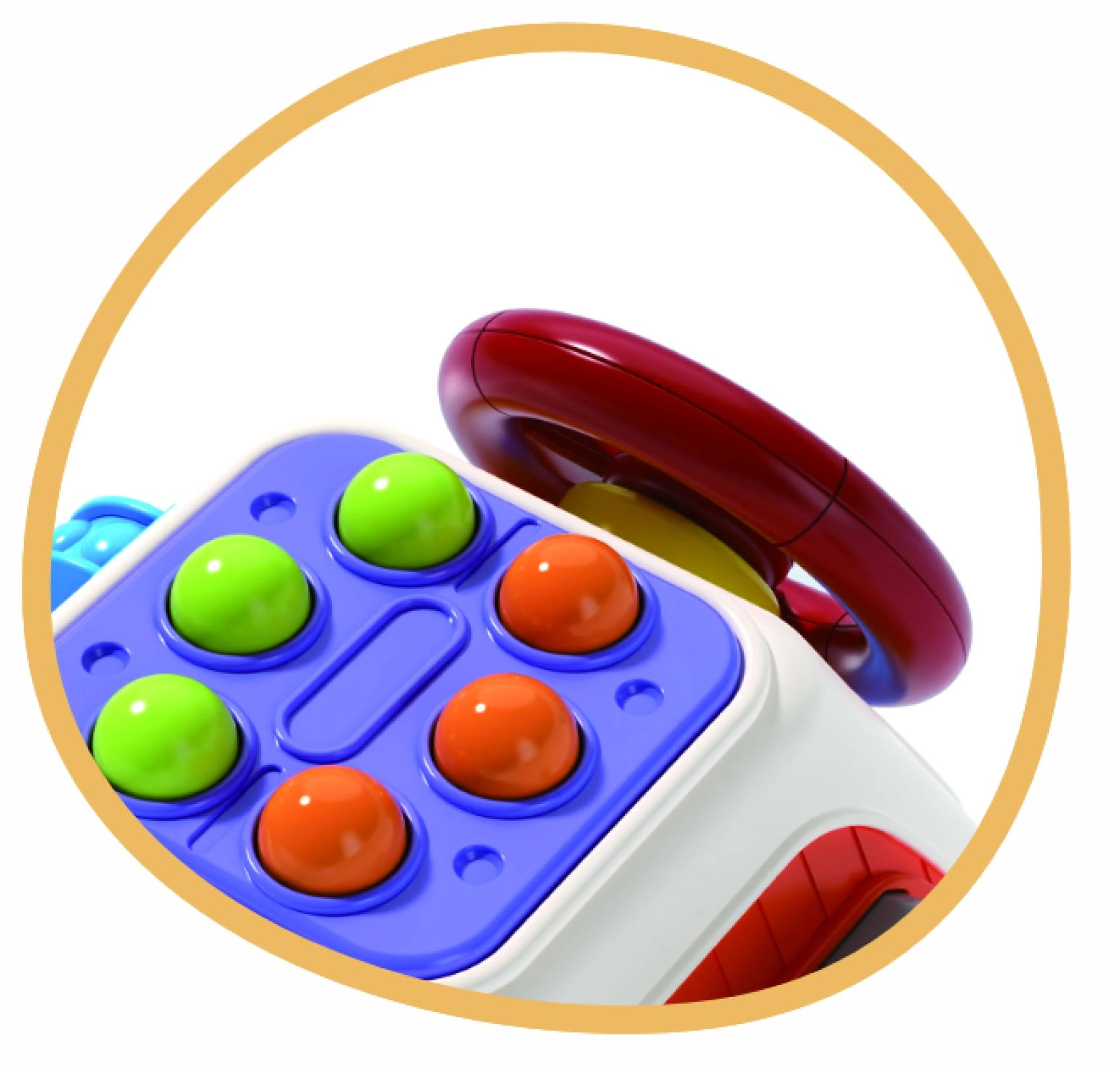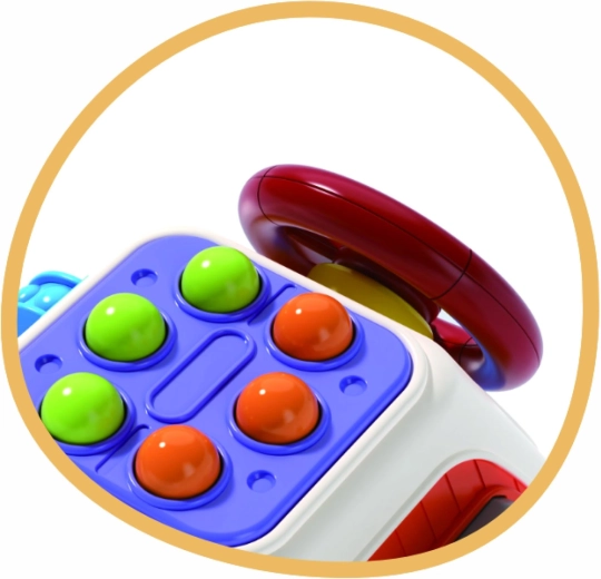 Különféle mechanikus elemek hívogatnak nyomkodásra és tologatásra. A gyermek gyakorolja az ujjait, a fogást és az ok-okozati összefüggések megértését.
