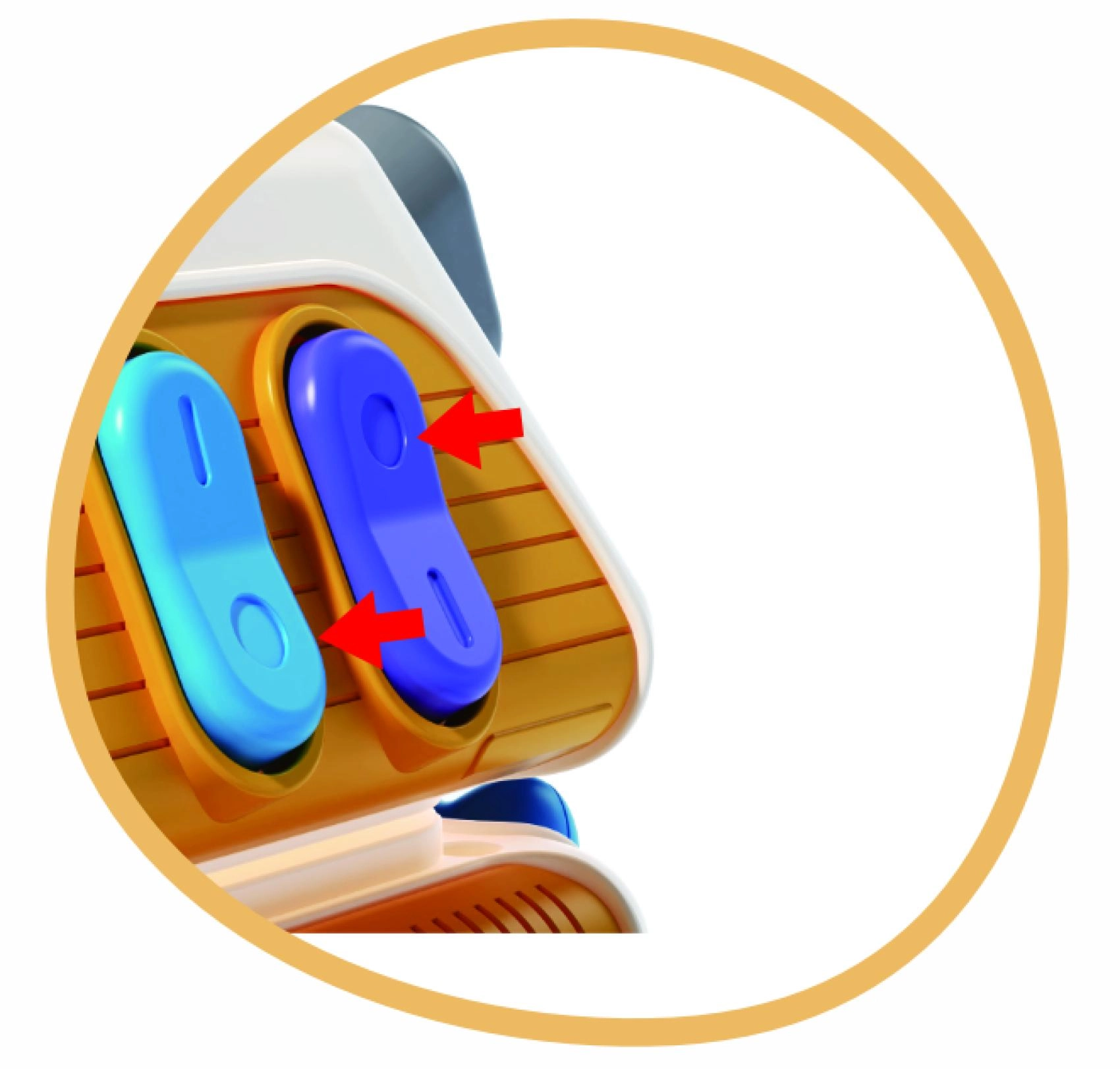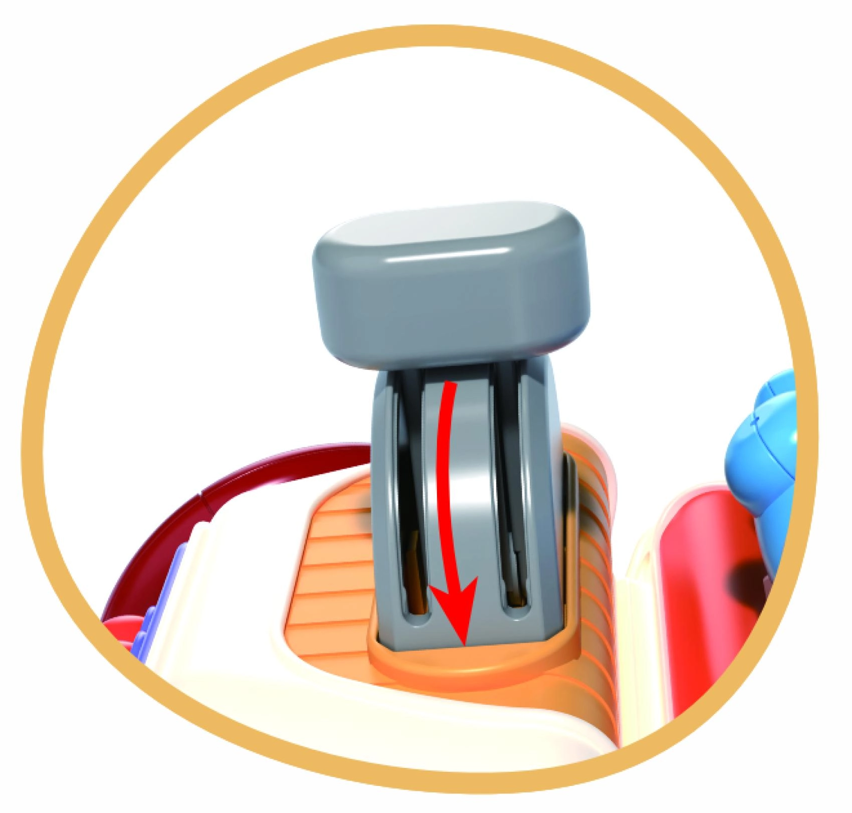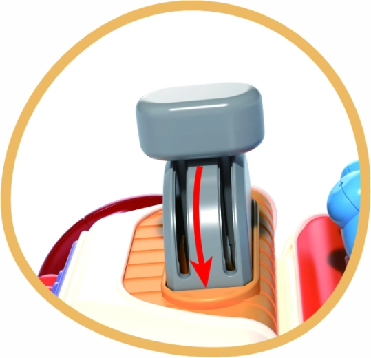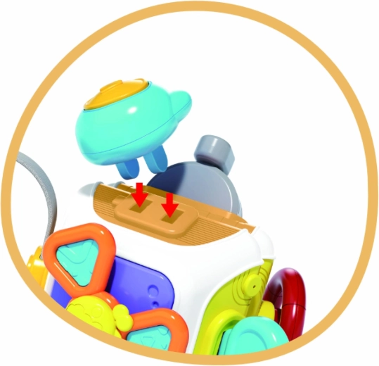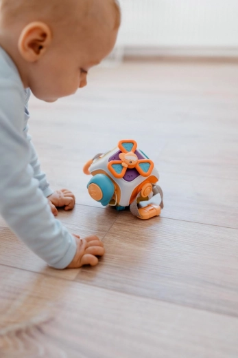 Különféle mechanikus elemek hívogatnak nyomkodásra és tologatásra. A gyermek gyakorolja az ujjait, a fogást és az ok-okozati összefüggések megértését.