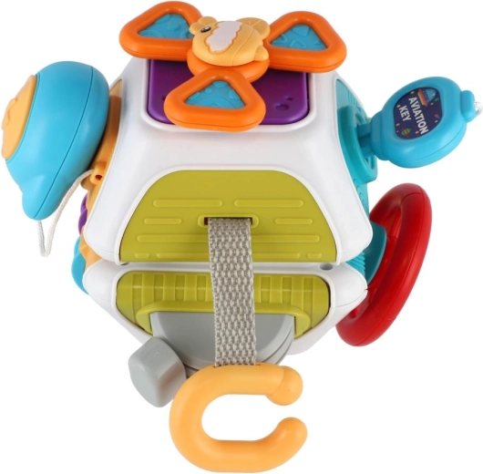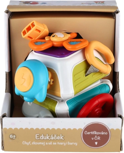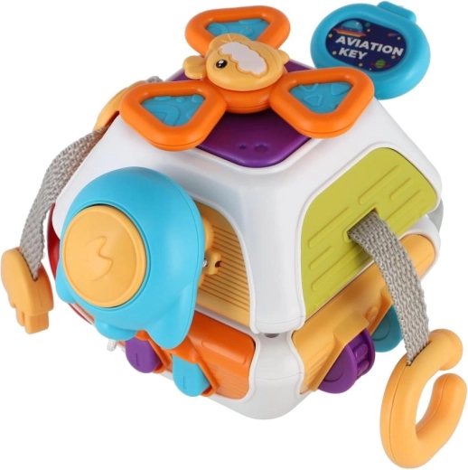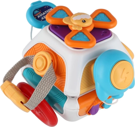Színes oktató kocka 6 hónapos kortól, amely minden oldalán más-más szórakozást és finommotorika-fejlesztést kínál. A gyerekek nyomkodhatják, forgathatják, tologathatják, és felfedezhetik a különböző textúrákat és formákat. A felső forgópropeller forgatásra csábít, a praktikus fogantyúk pedig megkönnyítik a kis kezek számára a tartást. A játék tanúsított Magyarországon, és támogatja az érzékelést, valamint a kéz–szem koordinációt.