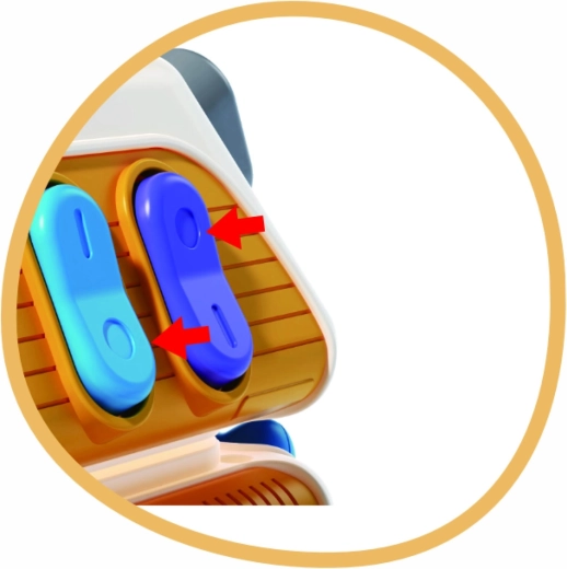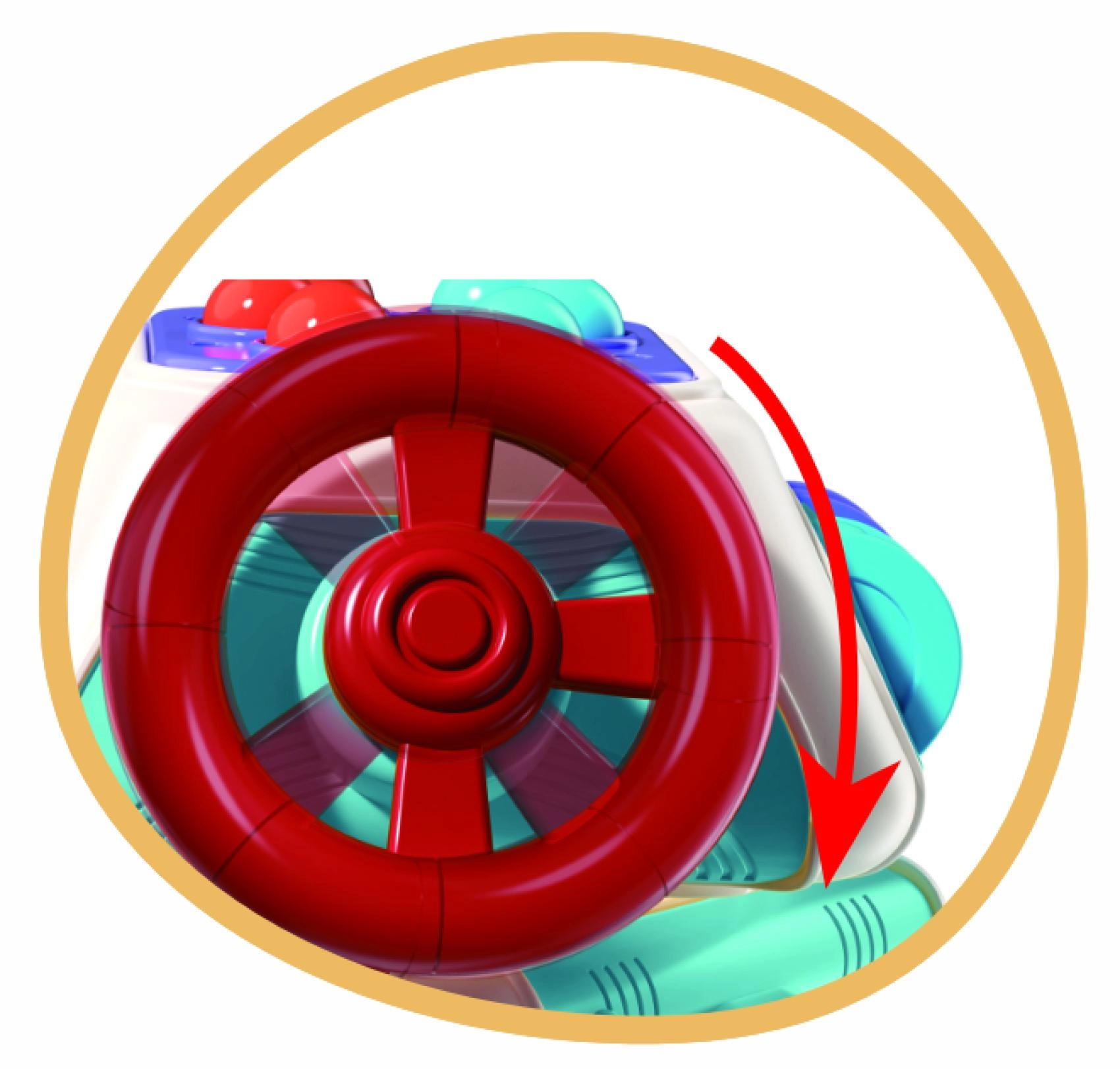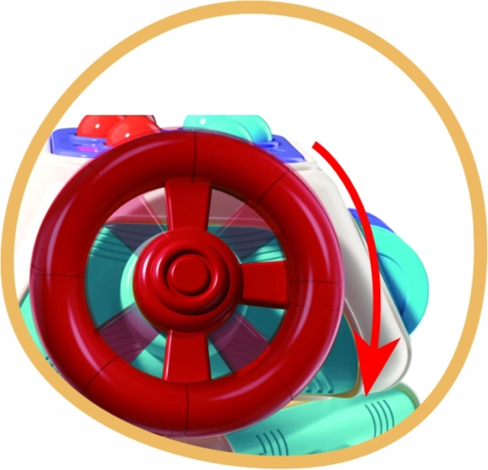 A felső propeller és a forgó kerekek ösztönzik a gyermeket a megfogásra és a folyamatos mozdulatokra, ezáltal természetes módon fejlesztik a kéz–szem koordinációt.
