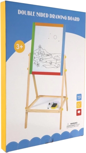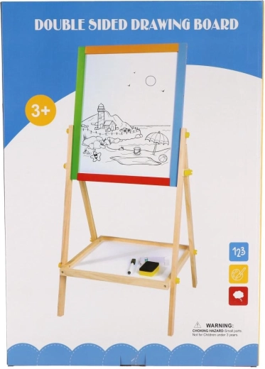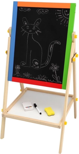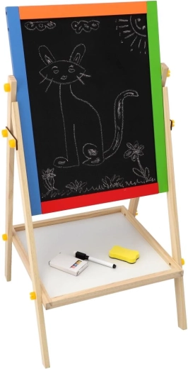 A praktikus, kétoldalas gyerektábla dupla szórakozást nyújt rajzoláshoz és tanuláshoz. Az egyik oldal fehér, mágneses filcekhez és mágnesekhez, a másik fekete, krétás a klasszikus rajzoláshoz. A stabil fa konstrukció biztonságos használatot garantál, és elegánsan illeszkedik bármely gyerekszobába. A csomag hasznos kiegészítőket is tartalmaz az azonnali használathoz.