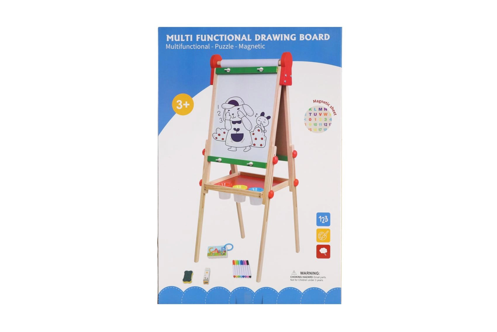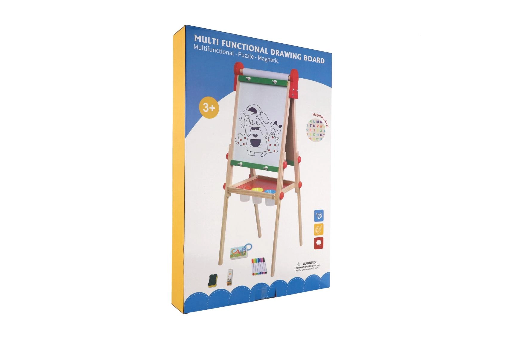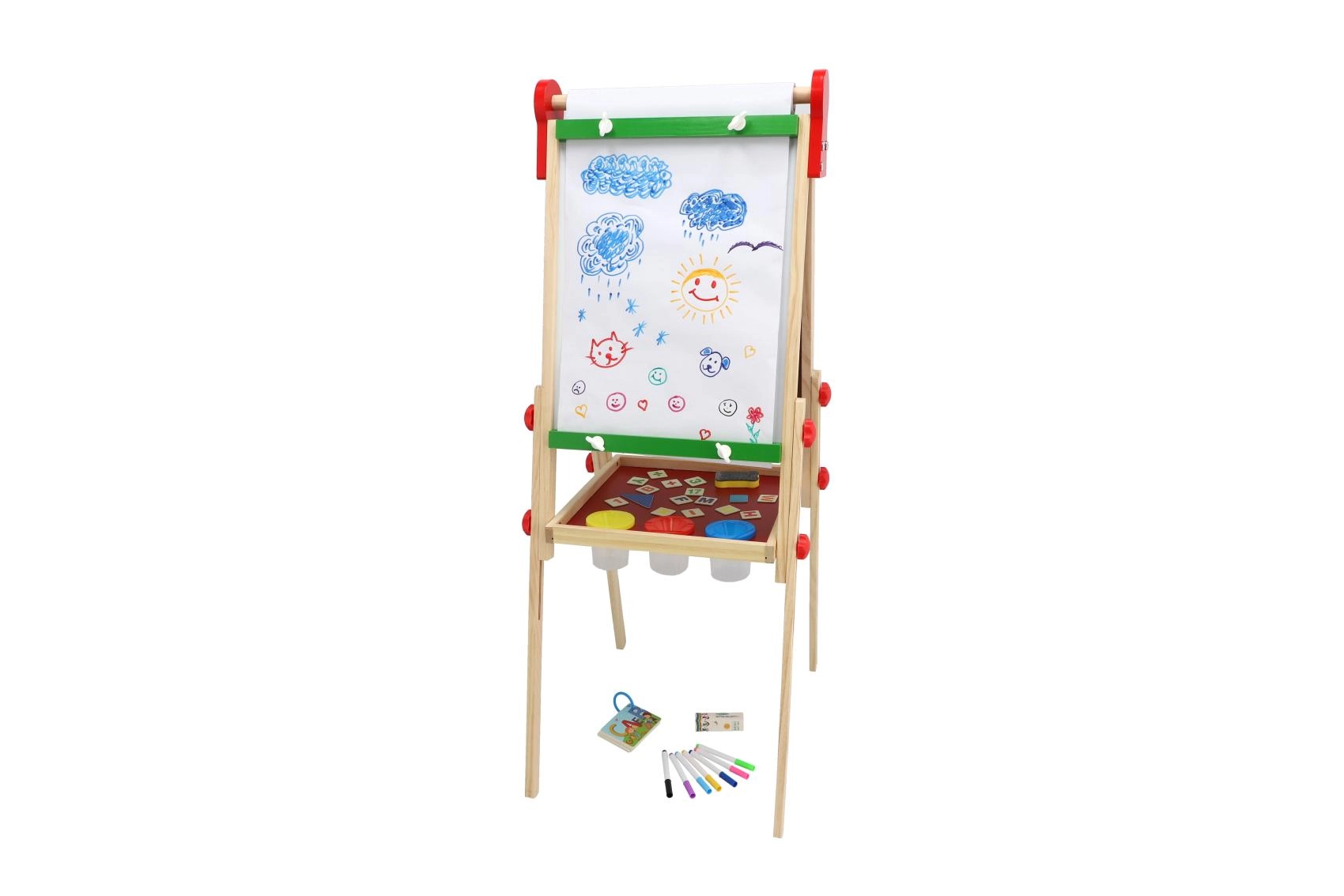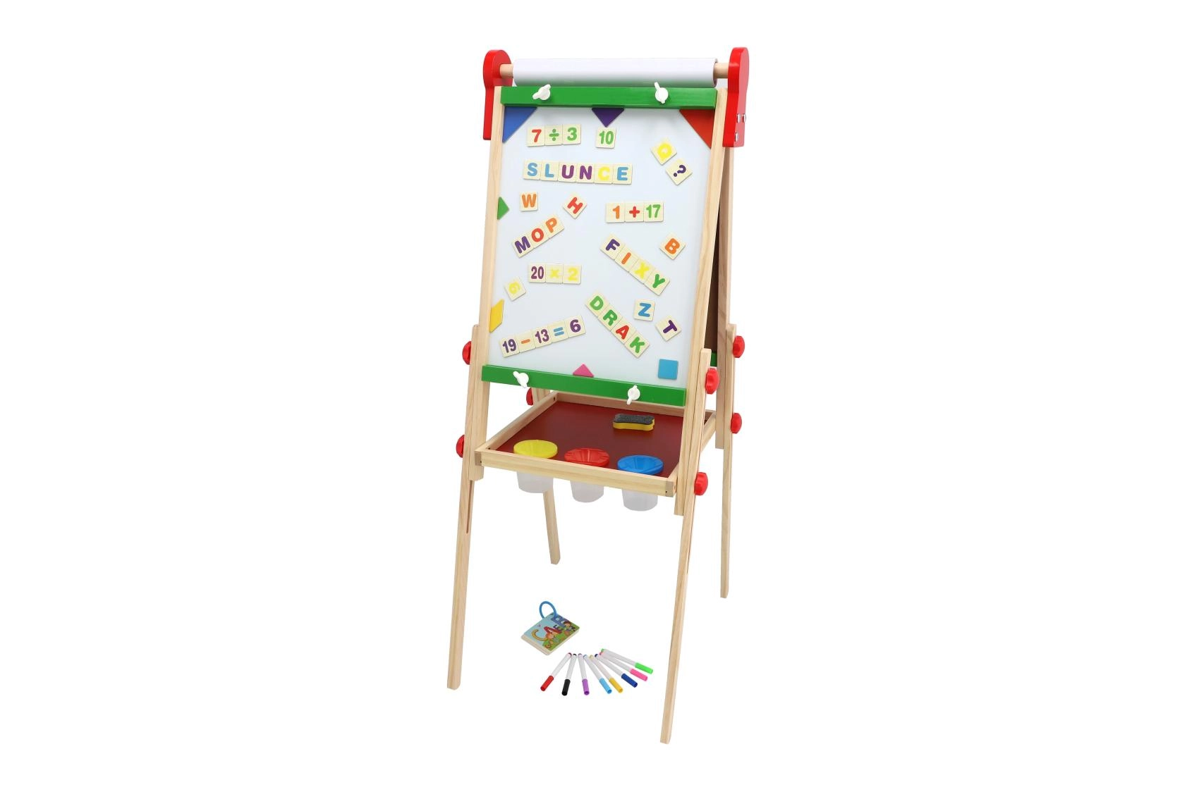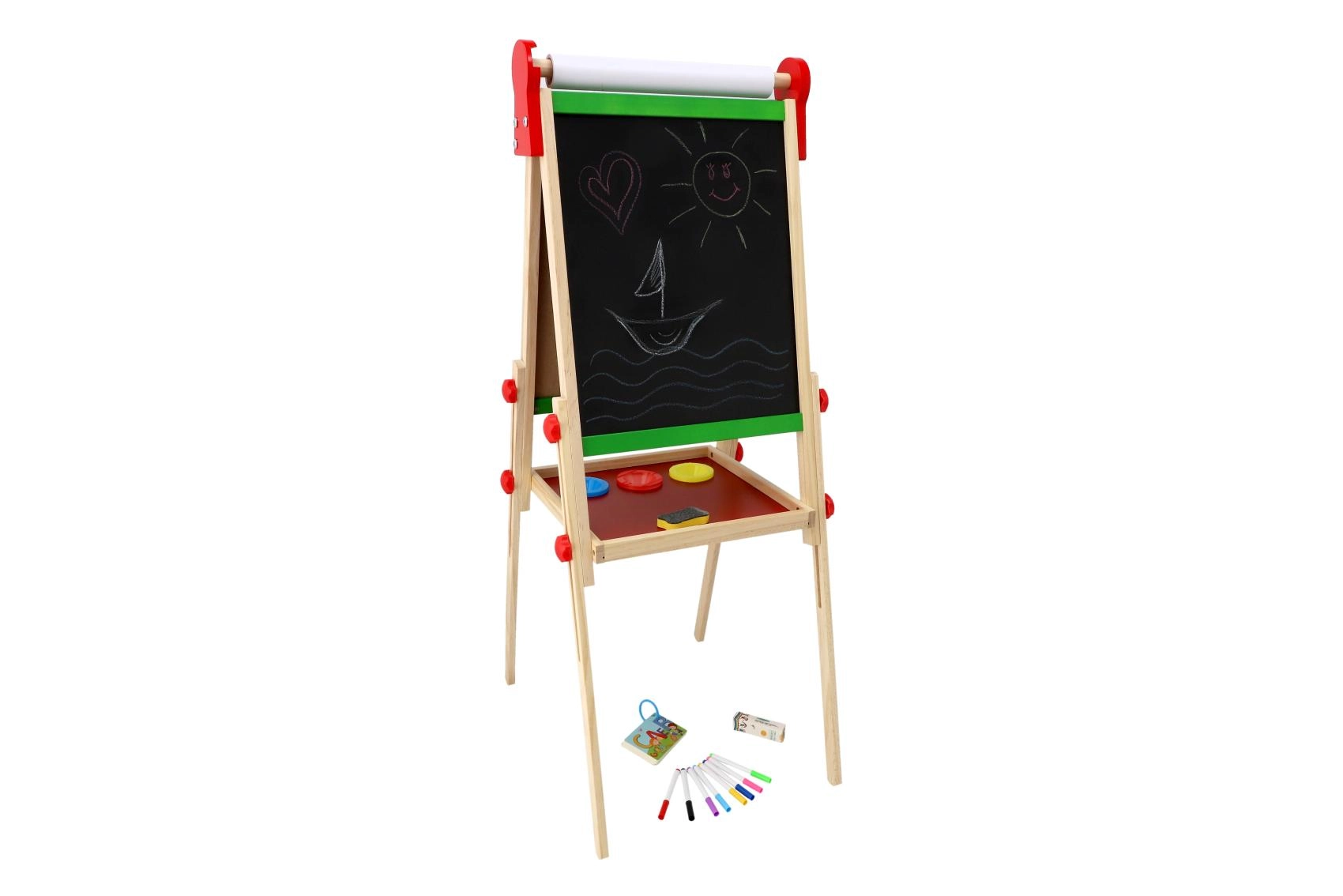A stabil fa szerkezet praktikus tárolópolccal kéznél tartja a krétákat, filceket és a szivacsot, így minden rendezett és biztonságos. A gazdag tartozékok támogatják a kreativitást, a finommotorikát és az iskolára felkészítő készségeket – írást, számolást és alakfelismerést.