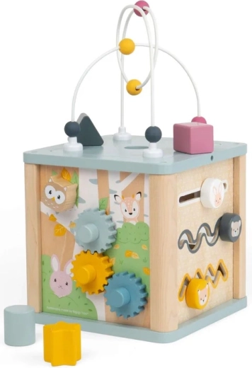 Fedezd fel a sokoldalú, fából készült aktivitáskockát kisgyermekeknek, amely órákon át tartó okos szórakozást kínál. Minden oldala más-más tevékenységet rejt – formabedobó, fogaskerekek, golyópálya és felül egy gyöngylabirintus. 100% FSC tanúsítvánnyal rendelkező fából készült, finom pasztellszínekben, a biztonságos játékért és a finommotorika, a kéz–szem koordináció és a problémamegoldás fejlesztéséért.