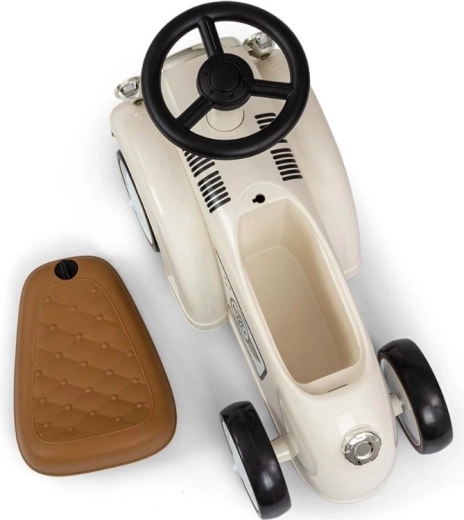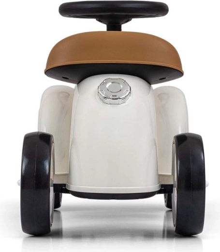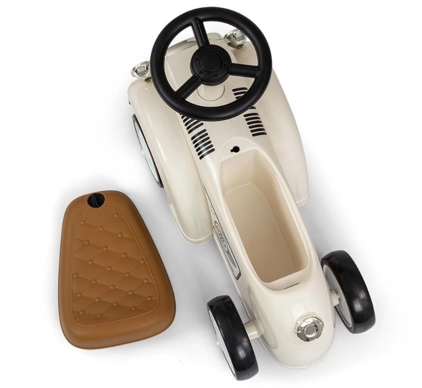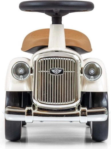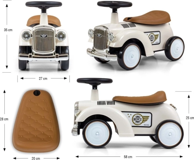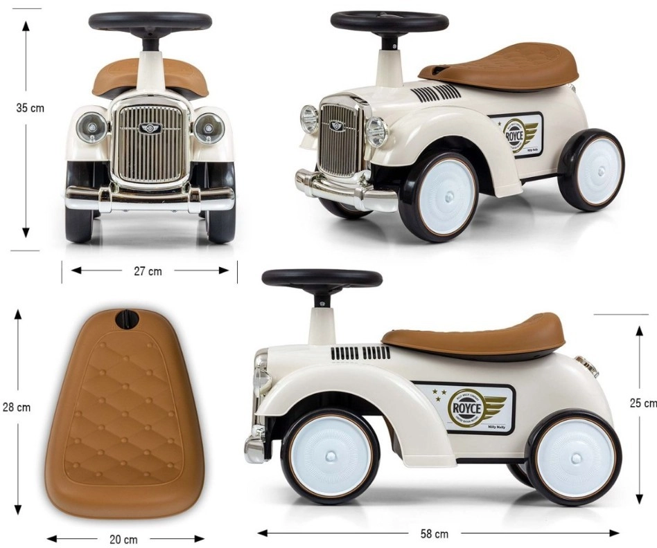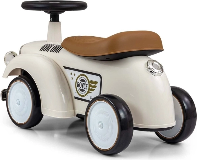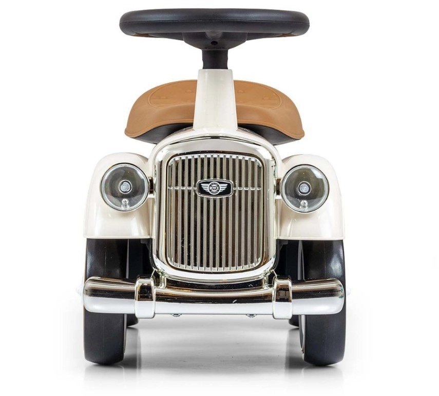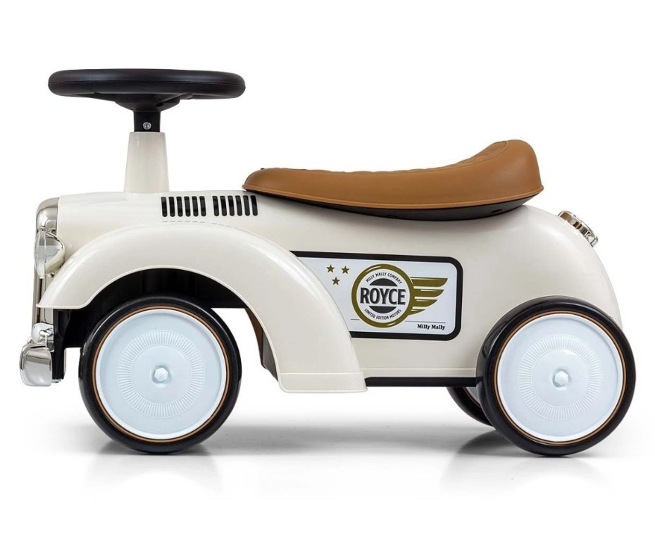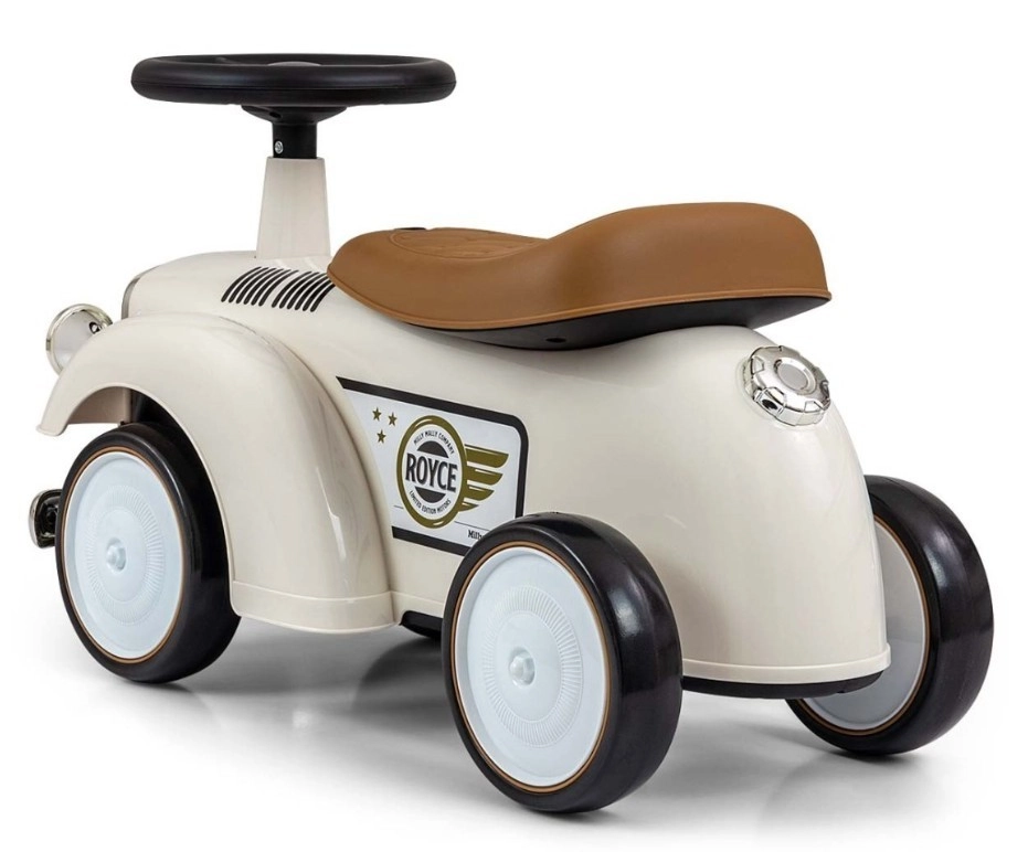 A Royce futóbicikli vintage megjelenésével, krómozott részleteivel és a ROYCE emblémával tűnik ki, ami elegáns karaktert kölcsönöz neki. A széles és stabil kerekeknek, valamint a kényelmesen formázott ülésnek köszönhetően ideális első járműnek azoknak a gyerekeknek, akik már önállóan tudnak ülni. A forgatható kormány könnyű manőverezést tesz lehetővé beltérben és séták során is.