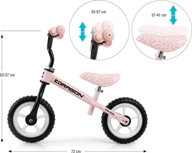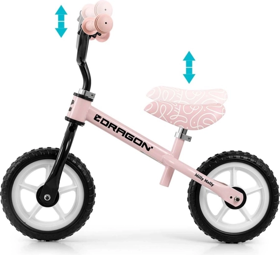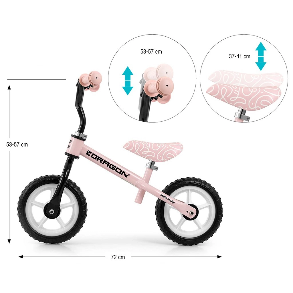 A MILLY MALLY Dragon futóbicikli természetes módon fejleszti a mozgáskoordinációt, a láberőt és a magabiztosságot az első lépésekhez a pótkerekek nélküli kerékpározás felé. A könnyű konstrukció könnyen hordozható, és bírja a játékot bent és kint egyaránt. A állítható nyereg- és kormánymagasság révén együtt nő a gyermekkel.