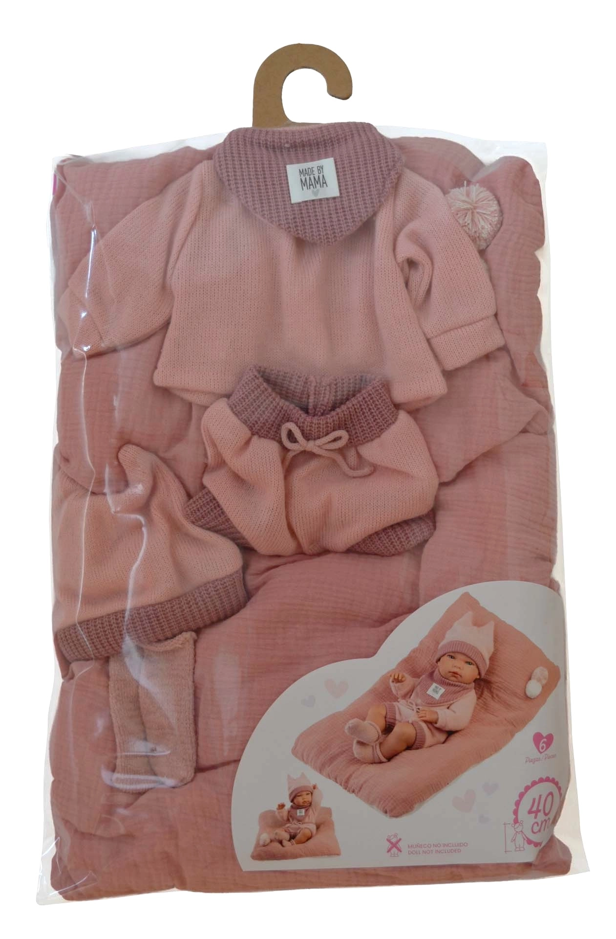A csomag része egy díszpárna is, amely puha alátétként a babának szolgál játék, pihenés vagy kiállítás közben. A szett ideális a mindennapi játékhoz, a „anyuka szerephez” és a kreatív babafotózáshoz.