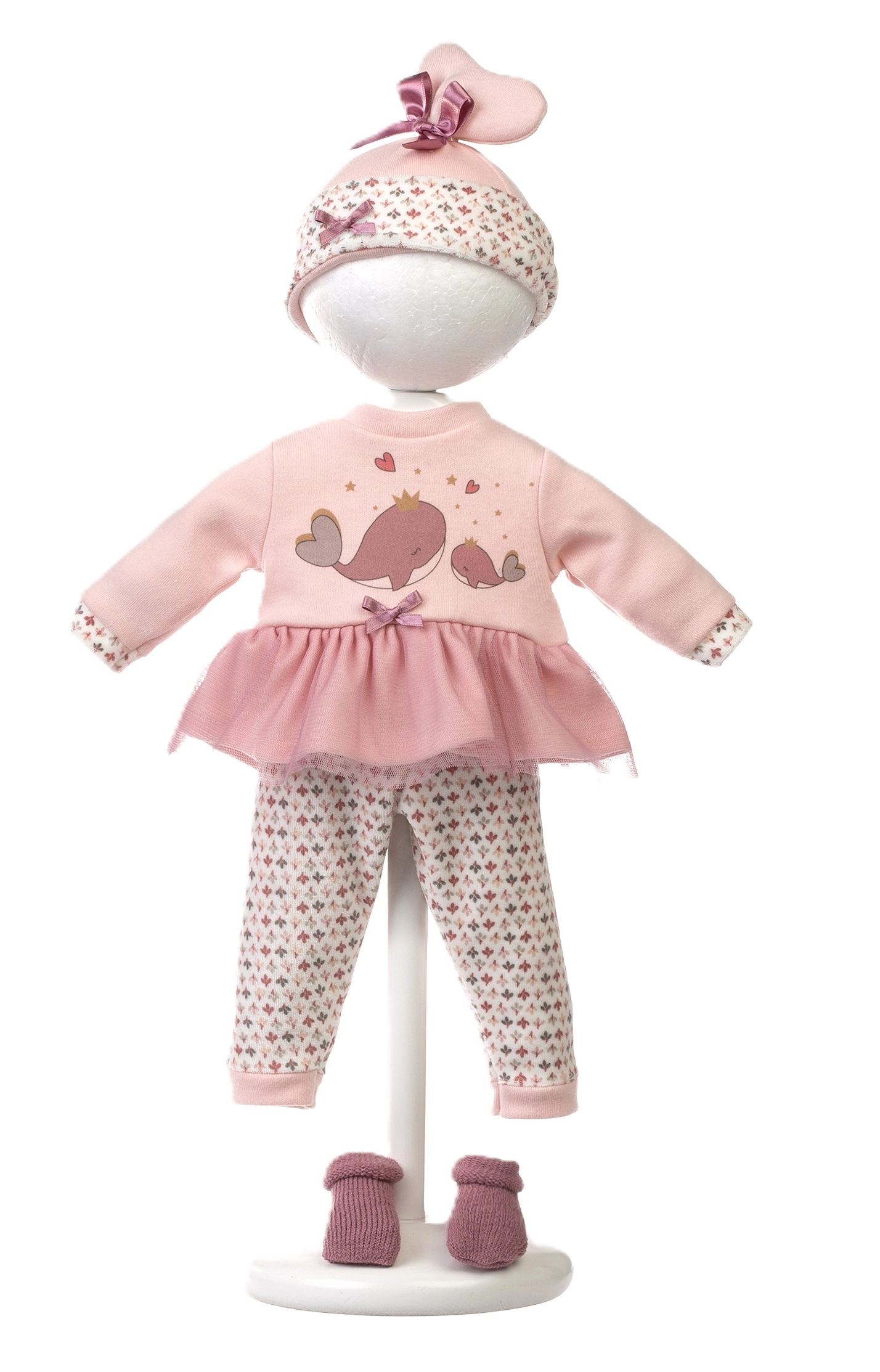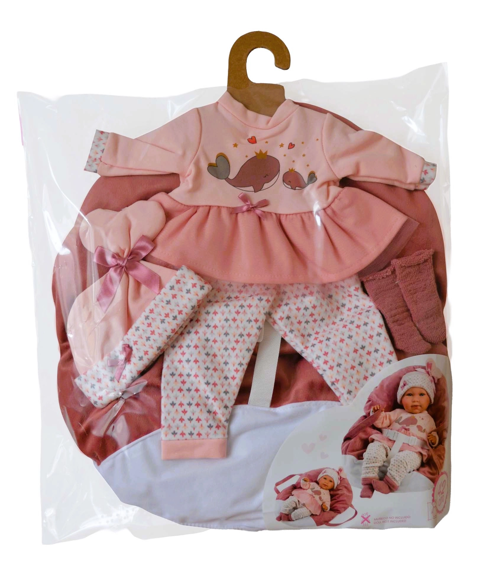 Öltöztesd a babát tetőtől talpig – a bálnás mintájú rózsaszín felső/ruhához leggings, sapka és cipőcske tartozik, melyet puha kézi hordozó egészít ki.