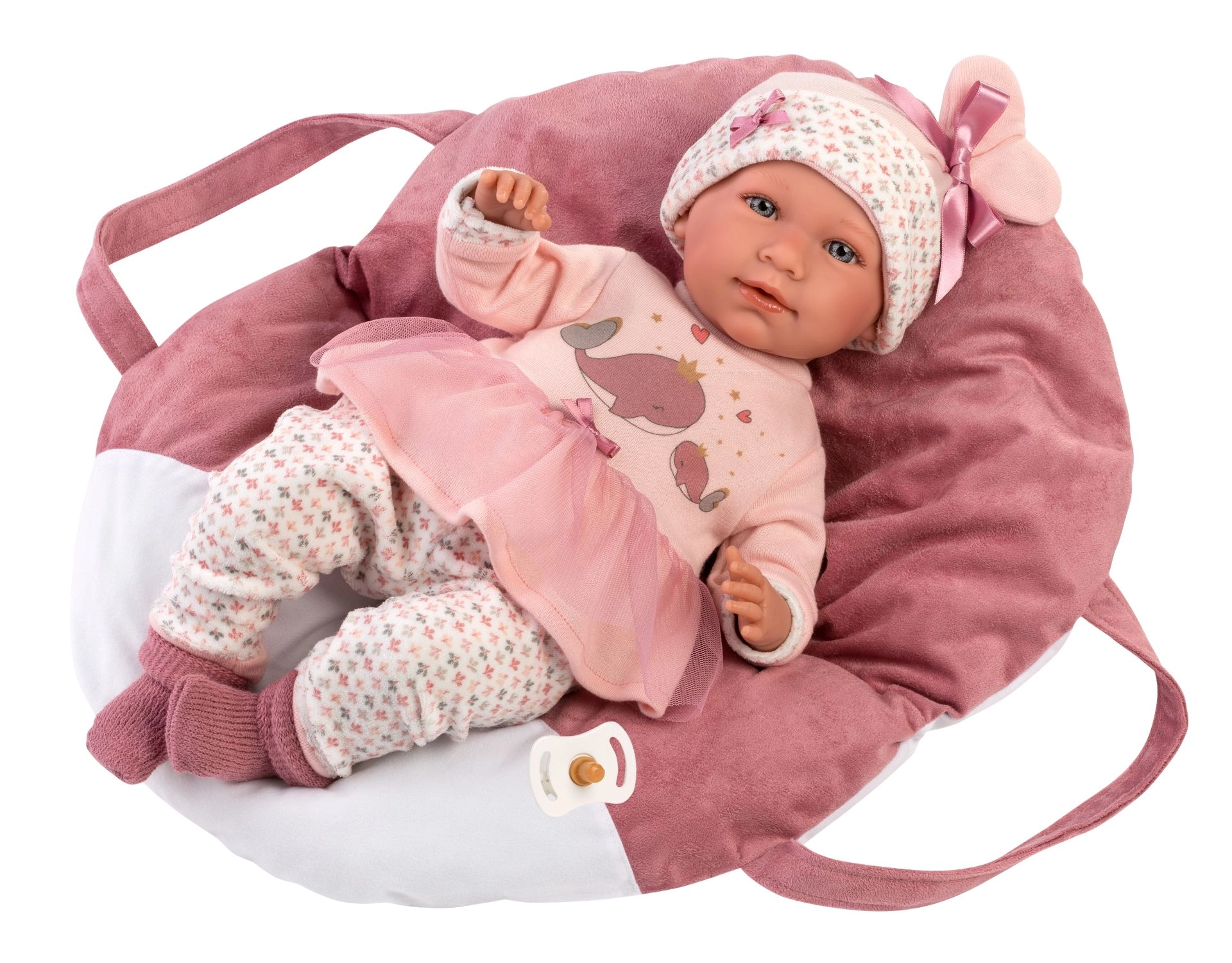 Stílusos LLORENS újszülött babaszett 40–42 cm-es babákhoz, amely 4 puha ruhadarabot és egy praktikus kézi hordozót tartalmaz biztonságos hárompontos rögzítéssel. Kézműves gyártás Spanyolországban, minőségi textíliák, összehangolt színek és bálna motívumok, melyek örömet szereznek a kis gondoskodóknak. Ideális szerepjátékhoz, átöltöztetéshez és a baba hordozásához.