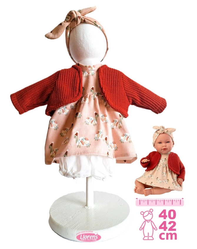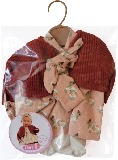 Stílusos, 4 részes ruha szett a New Born babához a Llorens márkától, 40–42 cm méretben. Kézzel készült Spanyolországban minőségi anyagokból, praktikus csomagolásban vállfával szállítva. Ideális a fantázia és a gondoskodás fejlesztéséhez játék közben. 3 éves kortól ajánlott.
