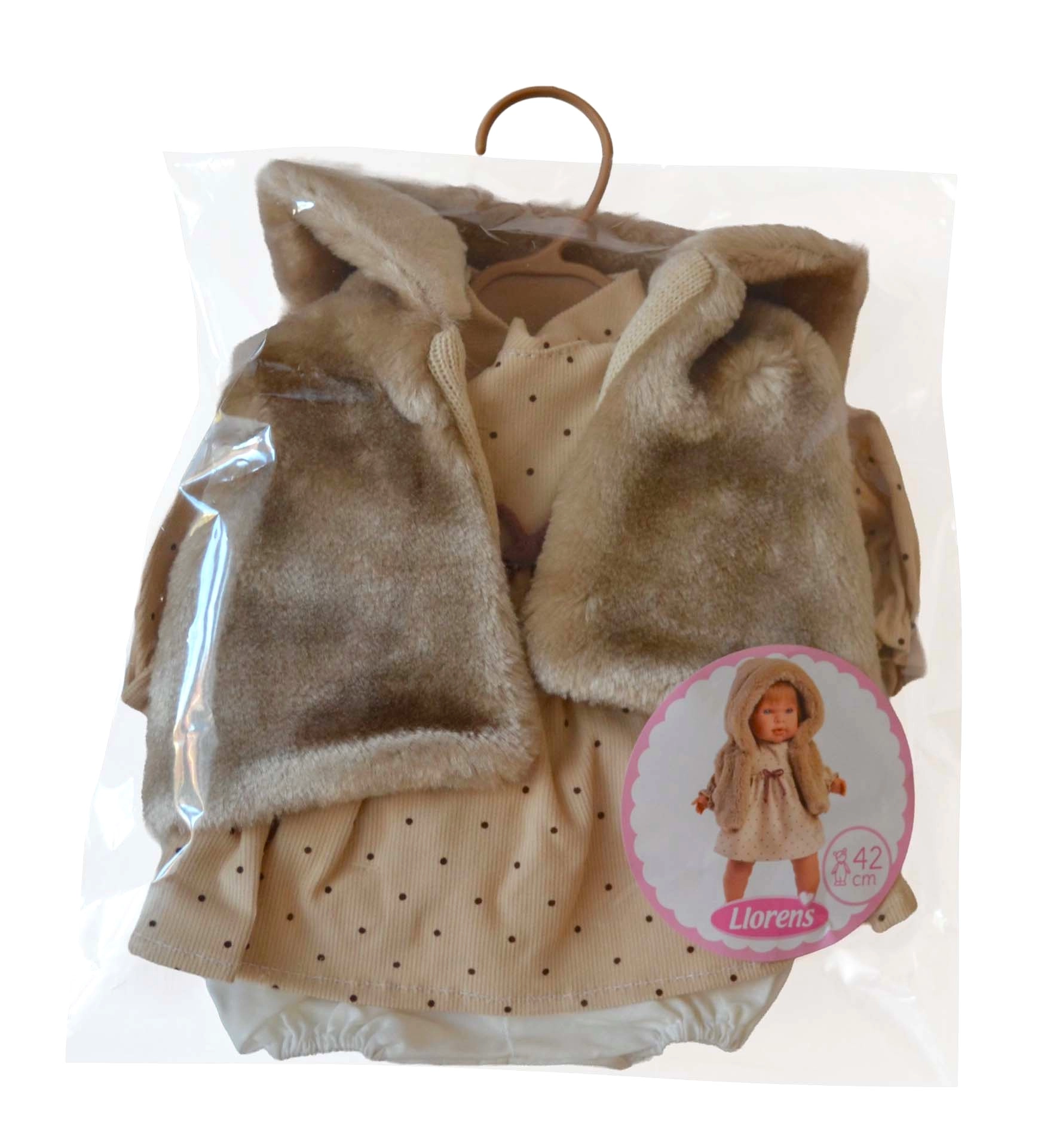 Stílusos, 3 részes babaruha a 42 cm-es Llorens babához, minőségi kivitelezéssel és bájos dizájnnal. A termék kézzel készül Spanyolországban, praktikus vállfás csomagolásban érkezik, és ideális 3 éves kortól.