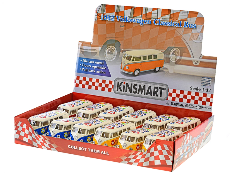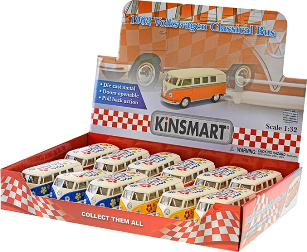 Egy klasszikus, ami sosem megy ki a divatból. A Kinsmart Volkswagen Classical Bus 1962 1:32 méretarányban 13 cm-es hosszban hozza el a legendás dizájnt, élethű karosszéria- és beltér részletekkel. A visszahúzós mechanizmusnak köszönhetően hátrahúzás után előre indul, és örömet szerez a kis sofőröknek és a történelmi járművek lelkes gyűjtőinek egyaránt.